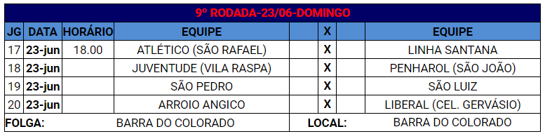 A próxima rodada (9ª) é a última da primeira fase, e será disputada no domingo (dia 23 de junho) na comunidade de Barra do Colorado.