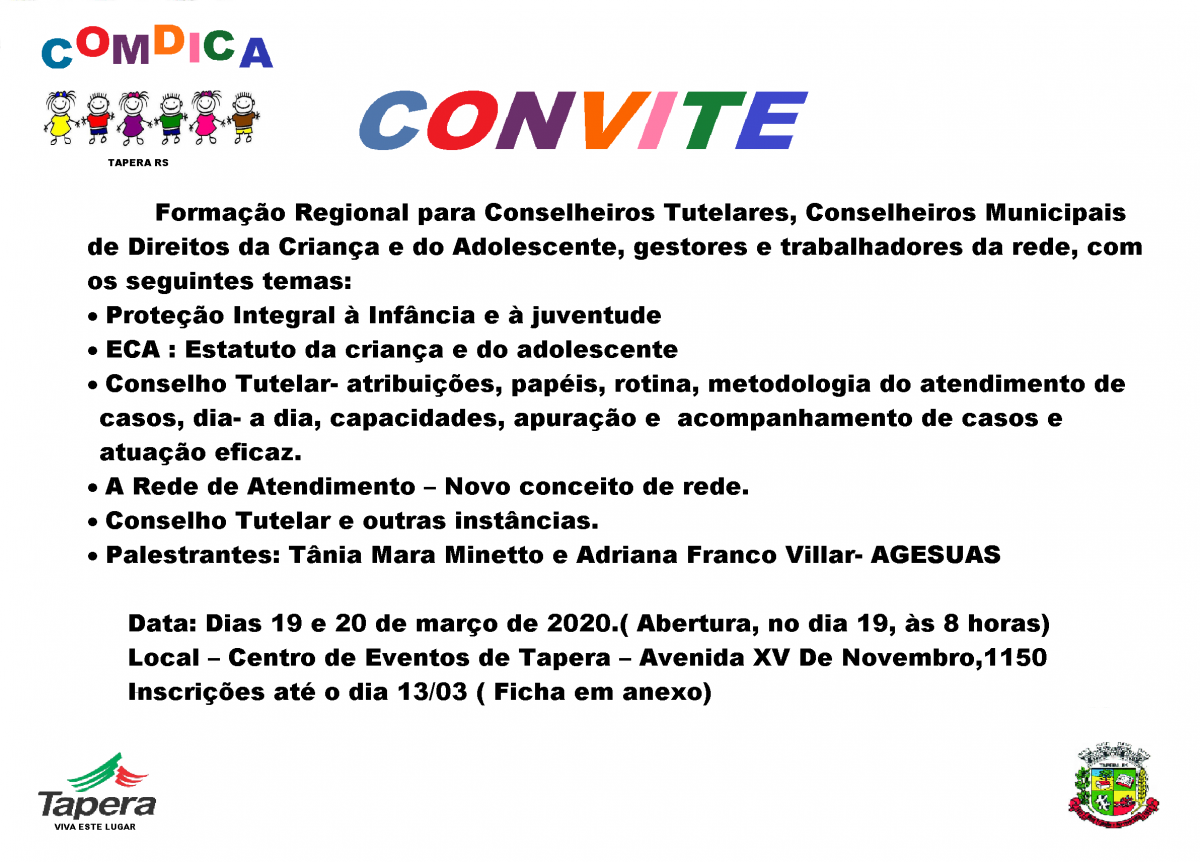 O Conselho Municipal dos Direitos da Criança e do Adolescente, COMDICA, promoverá curso de formação para Conselheiros Tutelares, Conselheiros Municipais de Direitos da Criança e do Adolescente, gestores e trabalhadores da Rede.