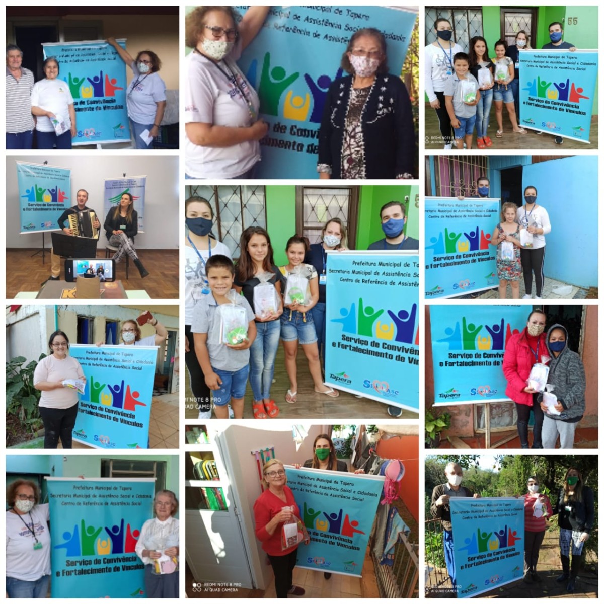 Nesse período da Pandemia, o CRAS também está com trabalho remoto, oferecendo atividades aos usuários do Serviço de Convivência e Fortalecimento de Vínculos para crianças, jovens e idosos, através de grupos de whatsapp ou levando material na casa.