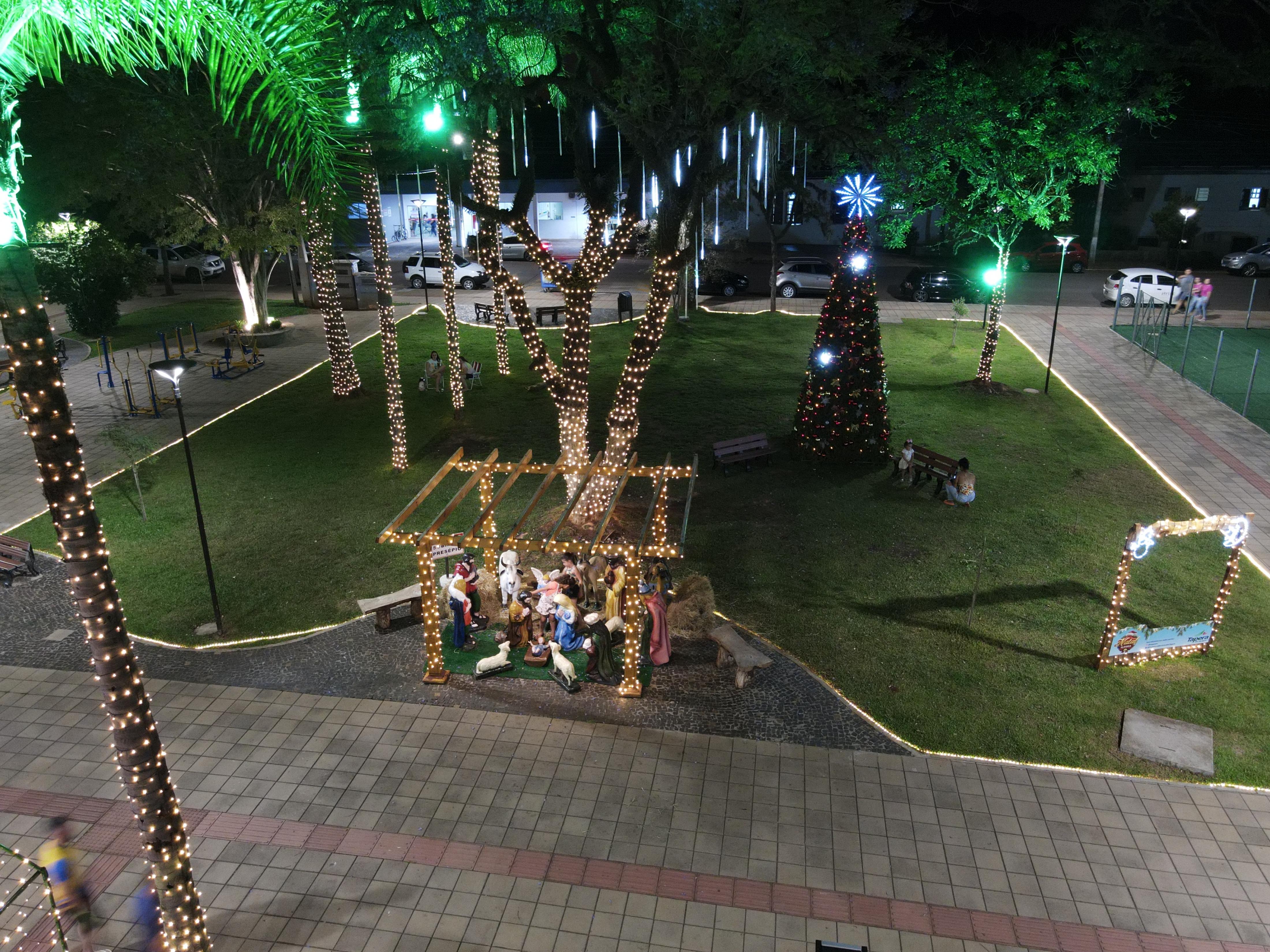 A tradicional decoração de Natal na Praça Dr. Avelino Steffens, no centro de Tapera recebeu neste ano um novo formato de decoração e iluminação. Além do presépio, a iluminação foi concentrada no entorno do playground, com nova iluminação na árvore de natal e a instalação de um túnel iluminado decorado com figuras natalinas.