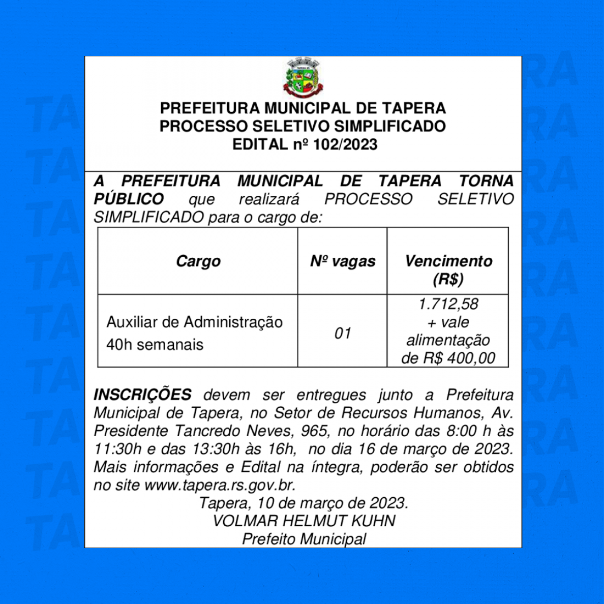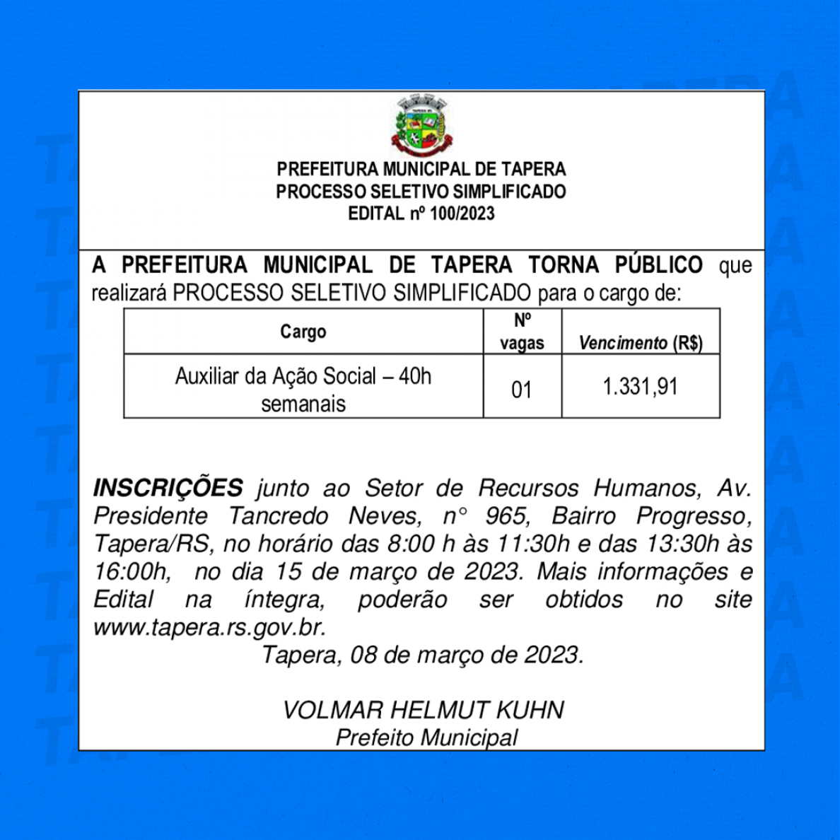Aberta as inscrições para os processos seletivos simplificados. Para mais informações, acesse o site da Prefeitura Municipal de Tapera (Concursos > Processo Seletivo > 2023) ou ligue: 3385-3300.