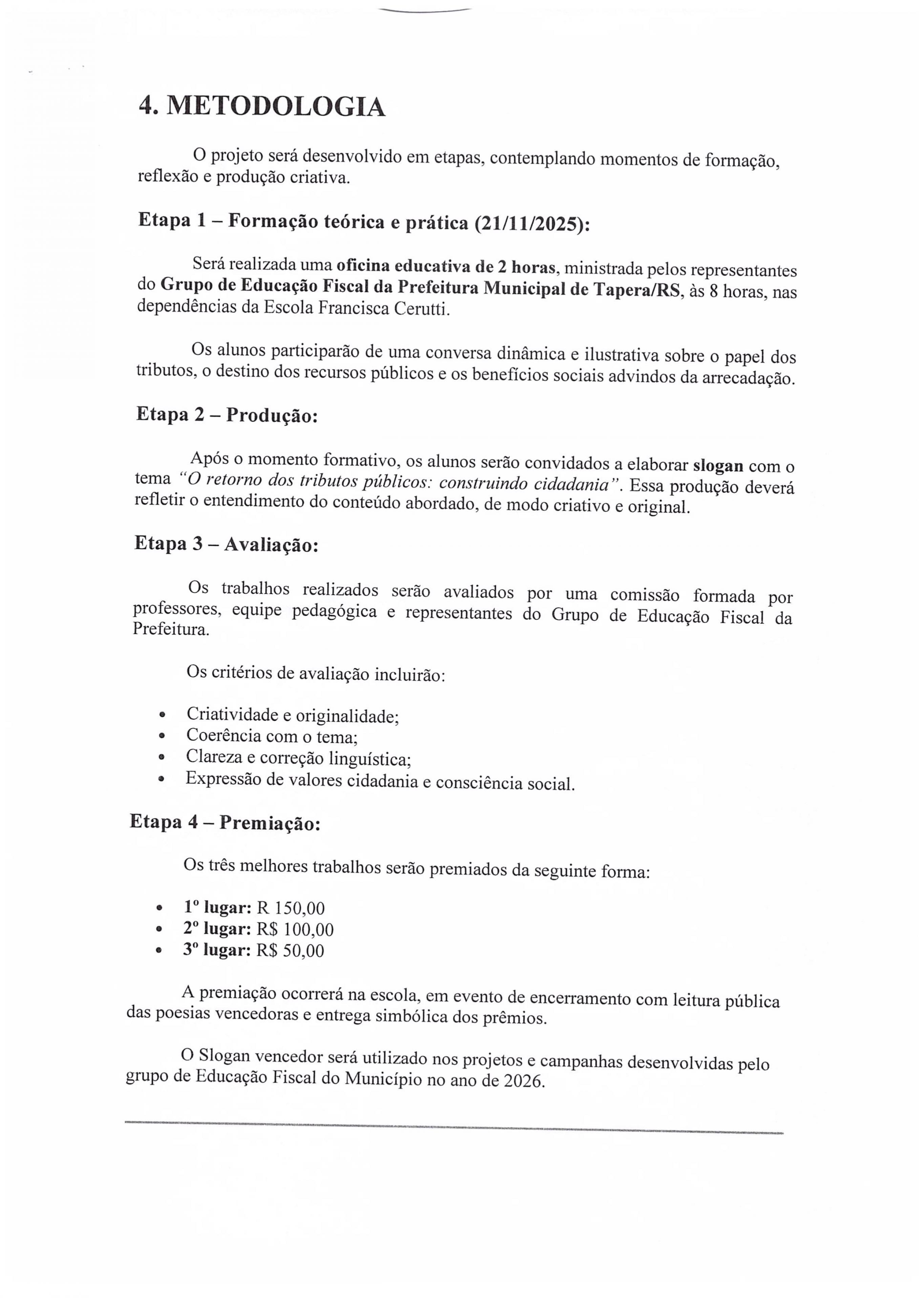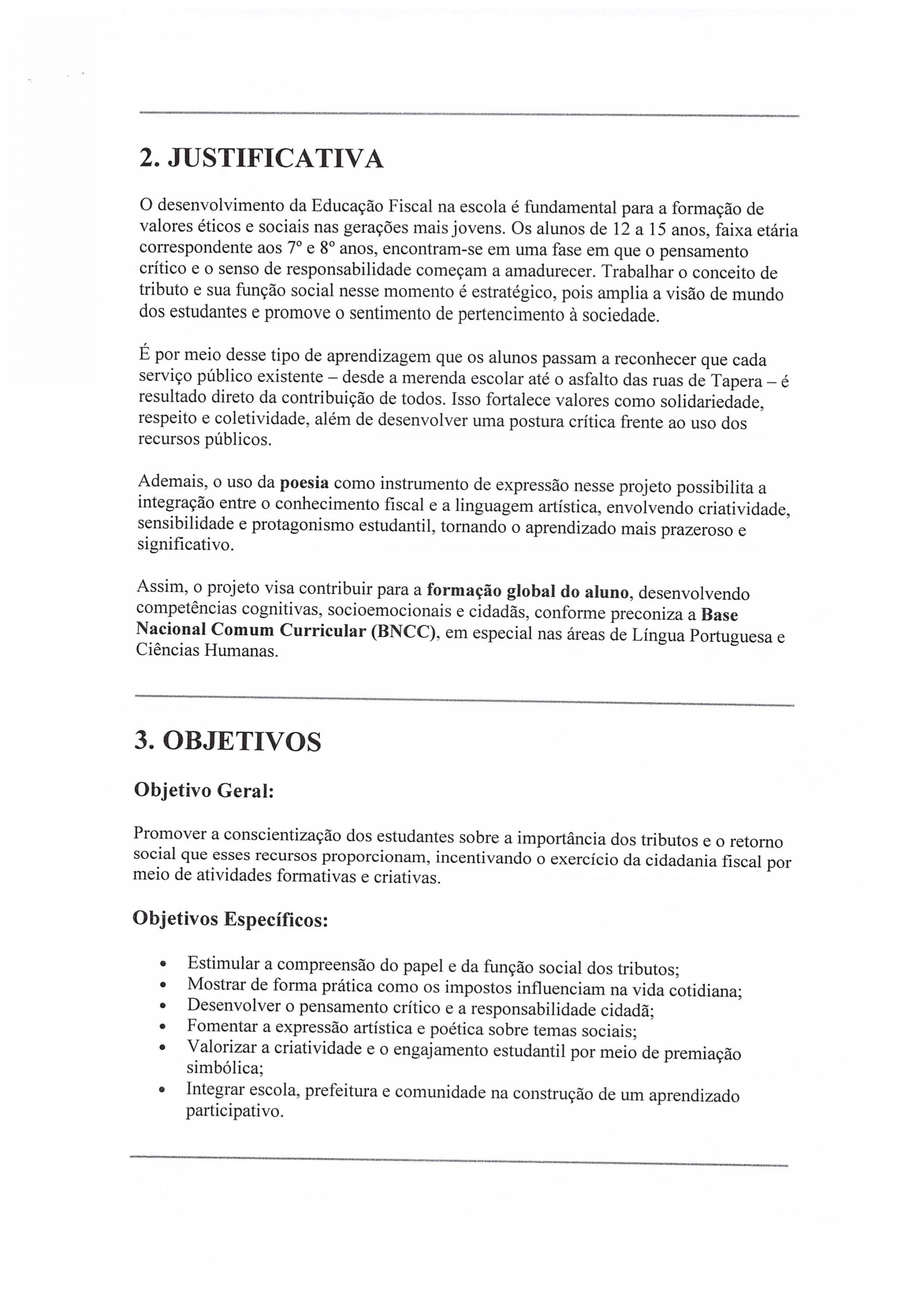O projeto reforça o compromisso da Administração Municipal e da comunidade escolar com a formação cidadã, promovendo a consciência fiscal, o senso de responsabilidade social e a compreensão do papel do Estado, além de integrar escola, Prefeitura e comunidade em um processo educativo participativo e transformador.