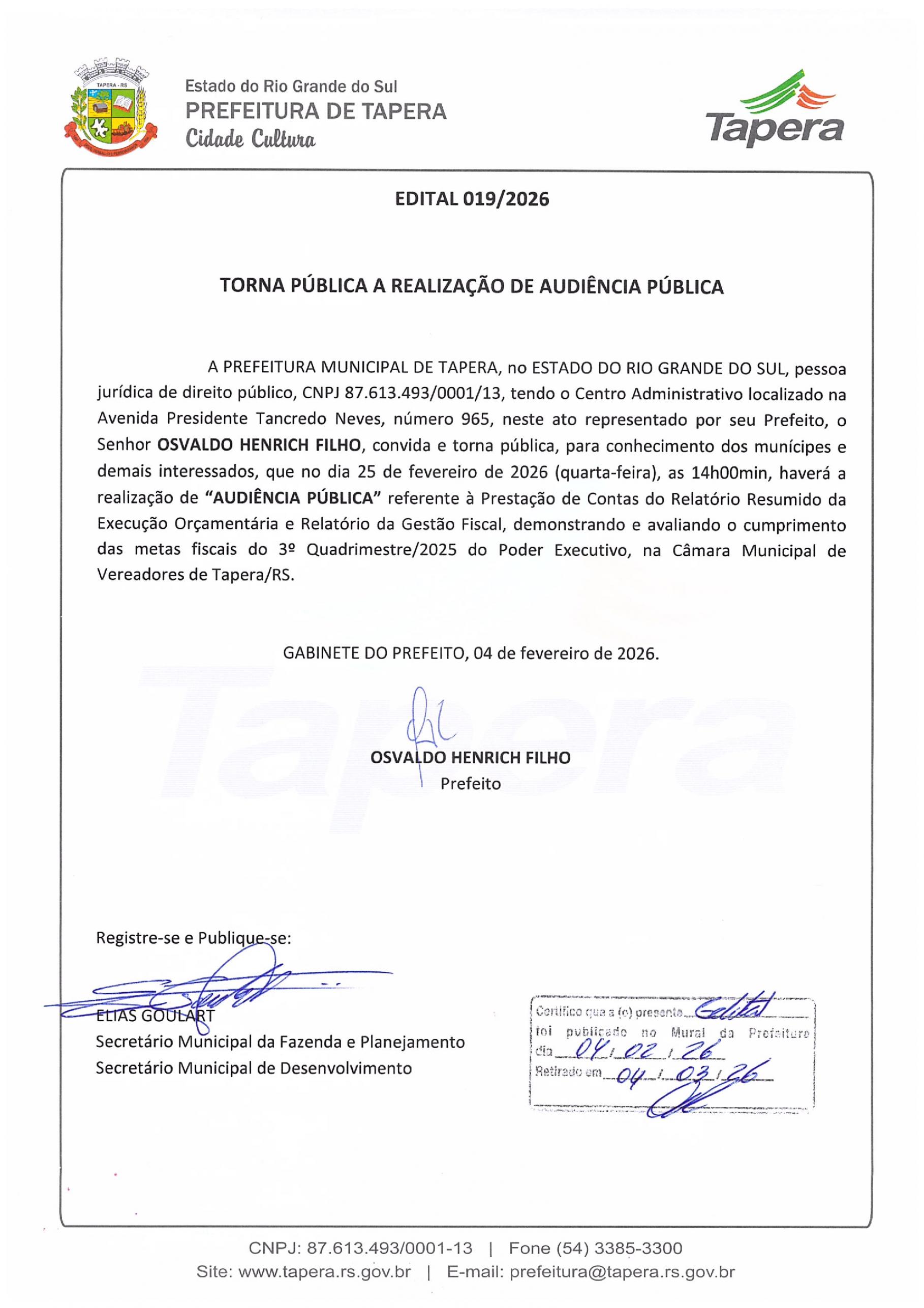 A Prefeitura de Tapera torna pública a realização de Audiência Pública no dia 25 de fevereiro de 2026, às 14h, na Câmara Municipal de Vereadores.