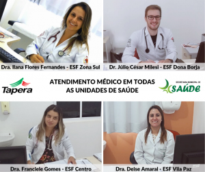Para garantir o atendimento à população mesmo com redução do número de médicos, a população que necessitava de atendimento, ao comparecer na sua unidade de saúde, era atendida pela equipe clínica, que fazia o encaminhamento médico nas outras unidades, sempre que necessário. ?Em nenhum momento deixamos o município sem médico disponível, sempre fizemos todo o esforço necessário para organizar os atendimentos e garantir o acesso de toda a população aos médicos?, disse a secretária municipal de Saúde Marisa Souza de Vargas. ?A qualidade de vida da comunidade é a prioridade da Administração, e a área da Saúde recebe atenção especial no município. A Saúde Pública Municipal de Tapera é referência em atendimento e nos esforçamos para manter essa qualidade?, destaca o prefeito Volmar Kuhn.