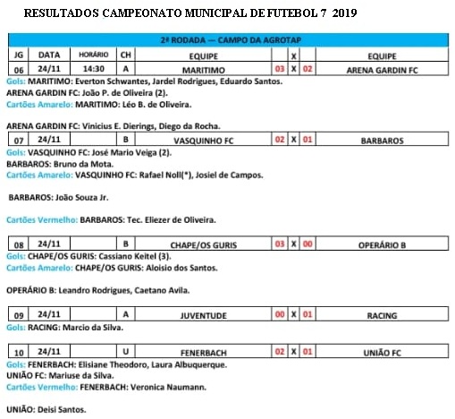 Teve prosseguimento no domingo, 24/11, o Campeonato Municipal de Futebol 7, 2019, com 5 partidas que aconteceram no campo da Agrotap.
