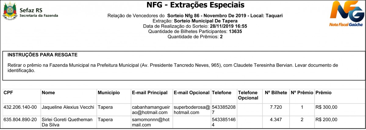 Contemplados da Nota Fiscal GaúchaContemplados da Nota Fiscal Gaúcha