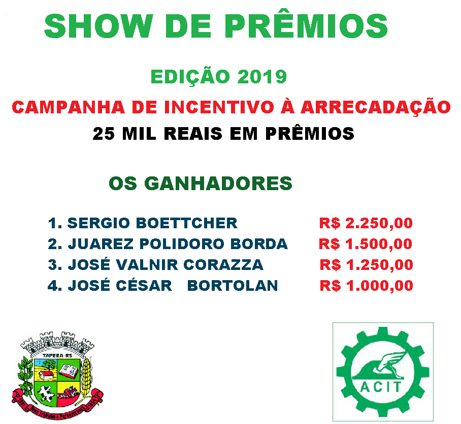 Foi realizado na tarde desta segunda-feira, 30/12, o sorteio do Show de Prêmios, edição 2019, campanha da Prefeitura Municipal e Associação Comercial e Industrial de Tapera, ACIT. Foi mais uma ação da Educação Fiscal do Município.