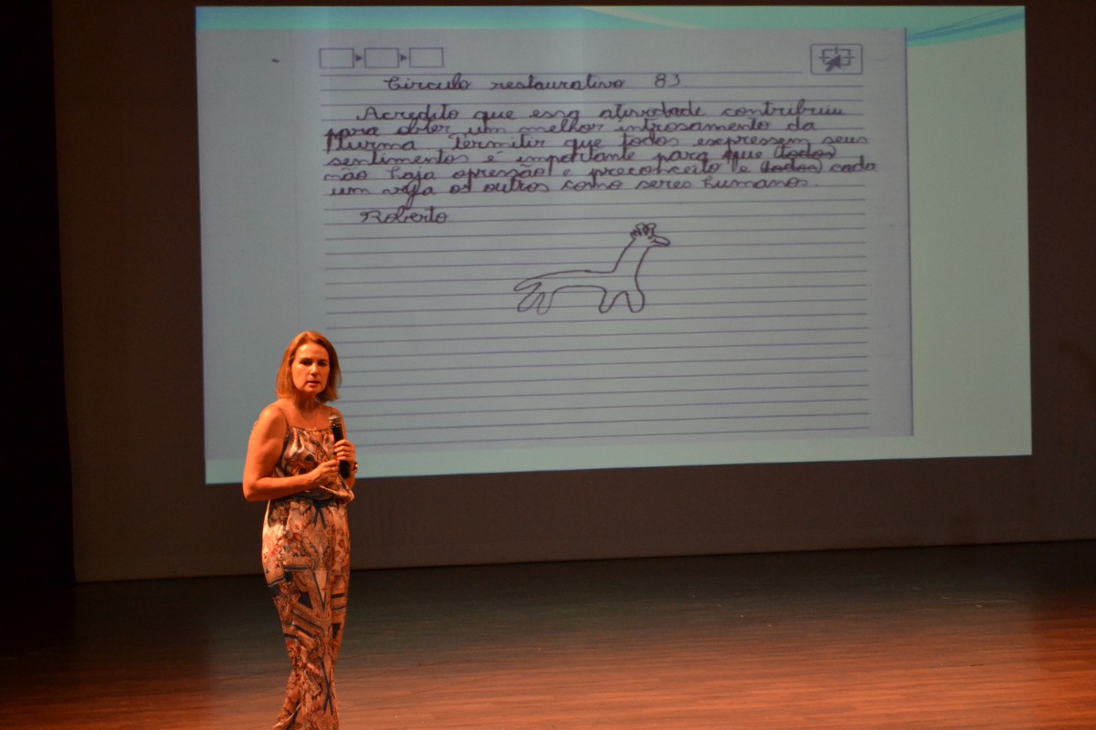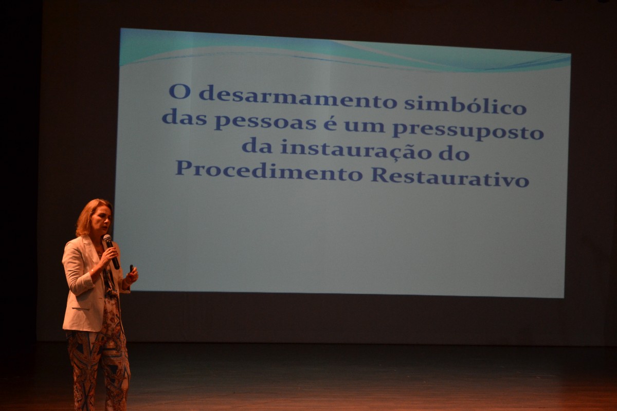 Durante a tarde, a Doutora Isabel Cristina Martins Silva, Assessora do Promotor de Justiça de Santa Maria, abordou o tema Práticas Restaurativas: a educação entrelaçando redes, como forma de construção do espaço educacional como ambiente de diálogo e cultura de paz.