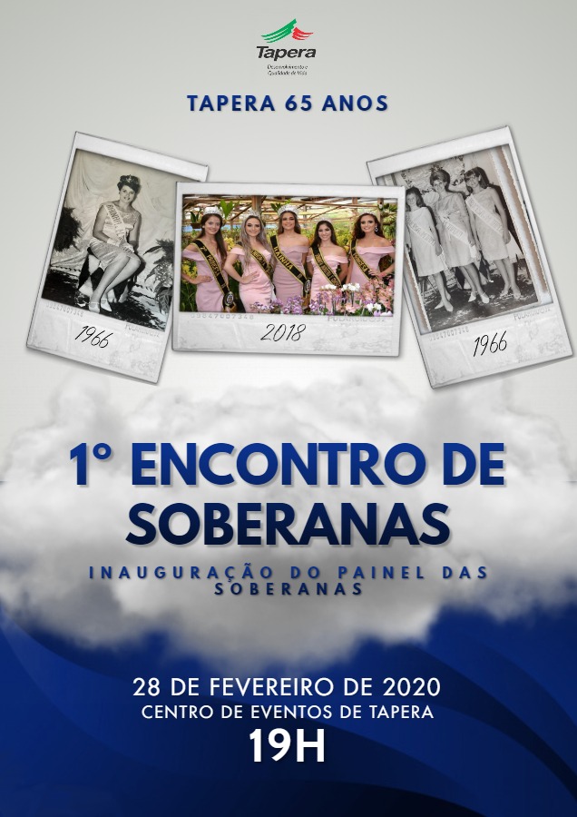 Como parte das comemorações do Aniversário de 65 anos de Tapera, será promovido o Encontro de Soberanas, que acontecerá na sexta-feira, 28/02, às 19:00h, no andar superior do Centro de Eventos de Tapera. Durante o Encontro será inaugurada a Galeria de Fotos das Soberanas do Município.