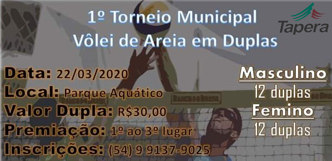 A competição acontecerá no domingo, dia 22 de março e será disputado na quadra de areia do Parque aquático com a coordenação de Leodegar Tischer. Haverá premiações para as três primeiras duplas classificadas. As vagas para participação serão limitadas a 12 duplas masculinas e 12 duplas no feminino. Somente poderão participar atletas de Tapera. As inscrições já estão abertas com taxa de R$ 30,00 por dupla e podem ser feitas através do WatsApp 54 99137 9025.