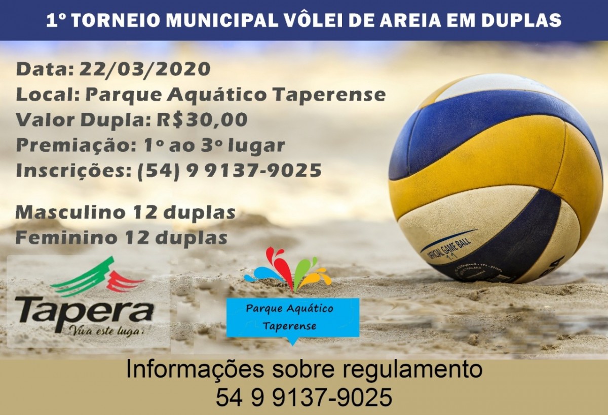 Vem aí o Primeiro Torneio Muncipal de Volei de Areia em Duplas. Realização da Secretaria Muncipal de Educação e Cultura, através da Diretoria de Desporto e Lazer, em parceira com o Clube Aquático Taperense.