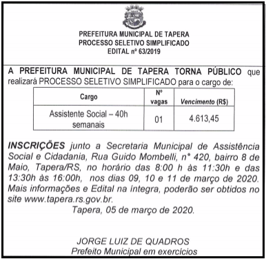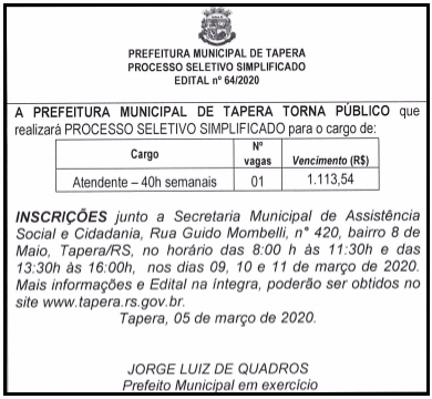 A Administração Municipal de Tapera abre processo seletivo para Assistente Social e Atendente.