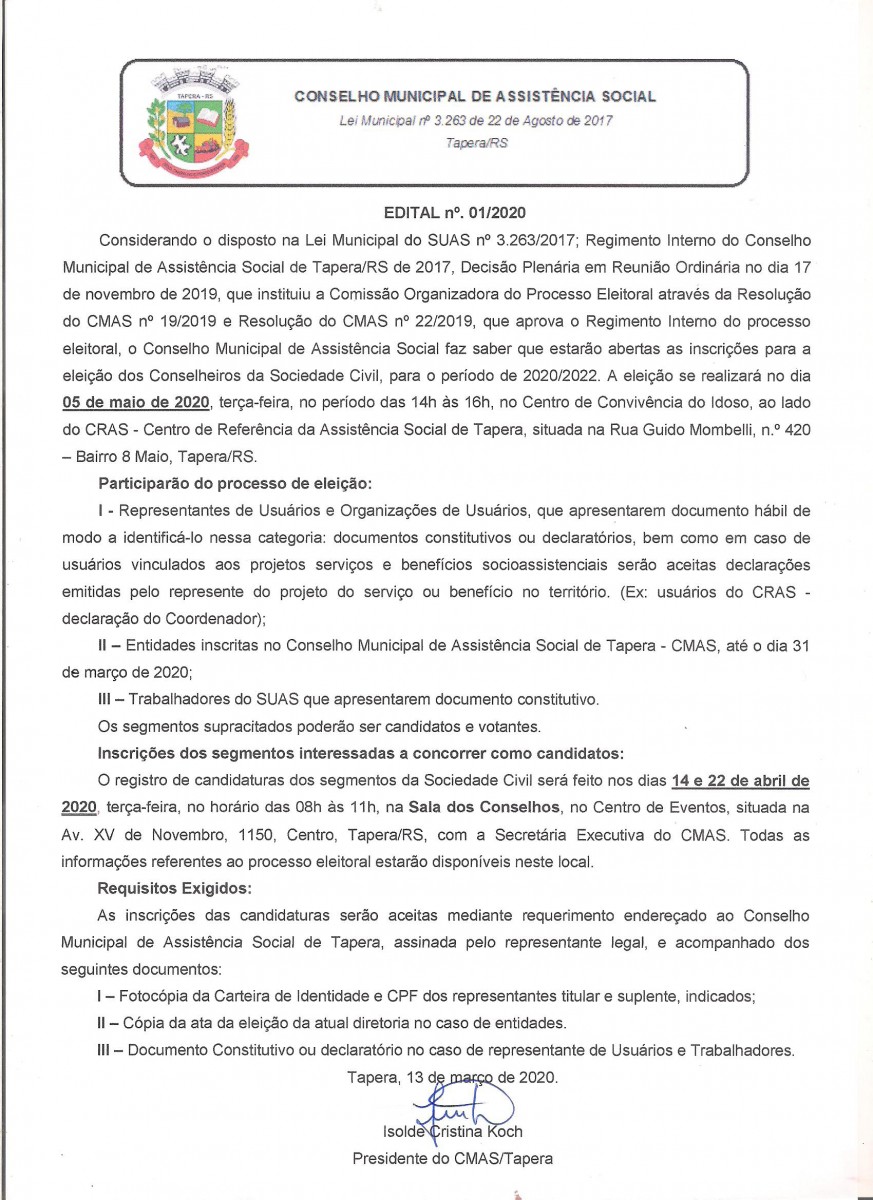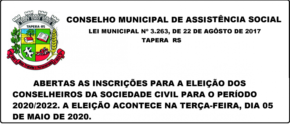 Abertas as inscrições para a eleição do Conselho Municipal de Assistência SocialAbertas as inscrições para a eleição do Conselho Municipal de Assistência Social