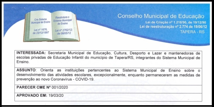 Diante das determinações de interrupção das atividades normais das escolas, visando combater a disseminação do coronavirus (Convid 19), o Conselho Municipal de Educação estabeleceu através do parecer 001/2020, a normatização das atividades à distância, baseada na Nota de Esclarecimento do Conselho Nacional de Educação e no Parecer 001/2020 do Conselho Estadual de Educação.