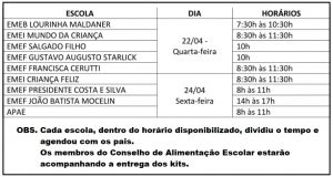 Cada aluno terá direito a um kit, porém, a família que não quiser ou não precisar fazer a retirada do alimento para complementar a alimentação de seu filho, poderá deixar registrado à diretora e este alimento ficará a disposição da escola para a merenda escolar no reinicio das aulas.