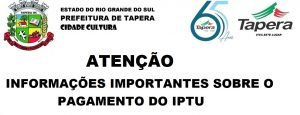 O Setor de Tributação e Arrecadação do Município de Tapera informa aos contribuintes que o pagamento da cota única do IPTU não pode mais ser efetuado com o boleto que está impresso junto ao carnê de 2020. Em função do registro junto ao sistema bancário, não foi possível alterar a data de vencimento deste documento. Desta forma, o contribuinte que desejar efetuar o pagamento integral do IPTU/2020 com o desconto, até o dia 15 de maio, deverá emitir outro documento pelo site da Prefeitura ou procurar o Setor para conseguir o novo boleto, a partir do próximo dia 27 de abril.