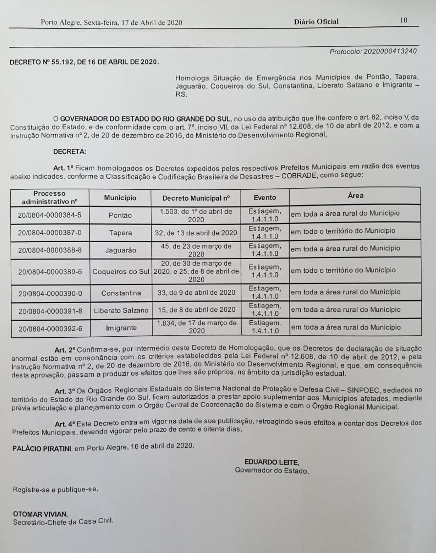 A Secretaria Municipal do Desenvolvimento, em nome da Administração Municipal informa que o Decreto 032/2020 de Situação de Emergência devido à estiagem foi homologado pelo Governo do Estado do Rio Grande do Sul, nesta sexta-feira 17 de abril, após publicação da decisão no Diário Oficial do Estado, através do Decreto Estadual no 55.192. Agora é necessário o Reconhecimento por parte do Governo Federal.