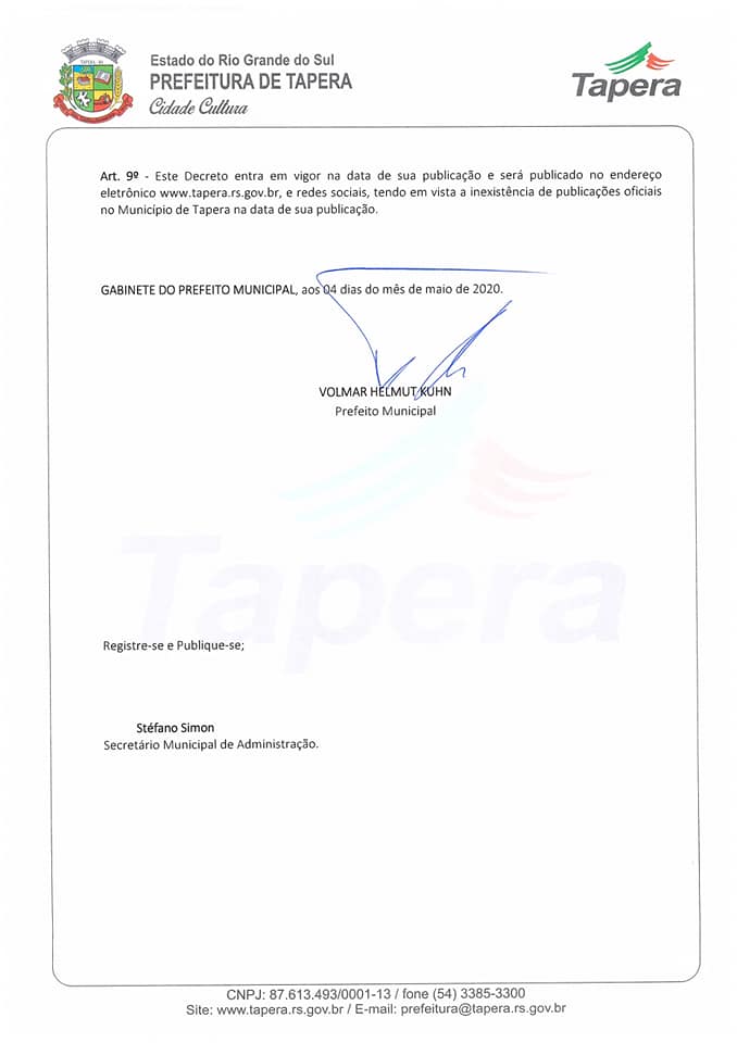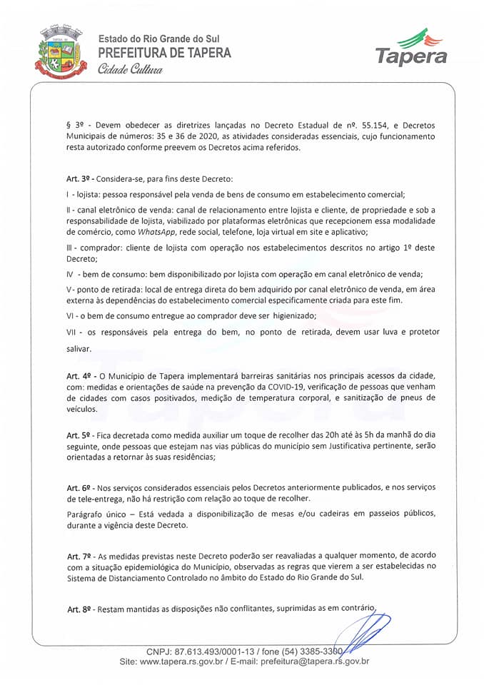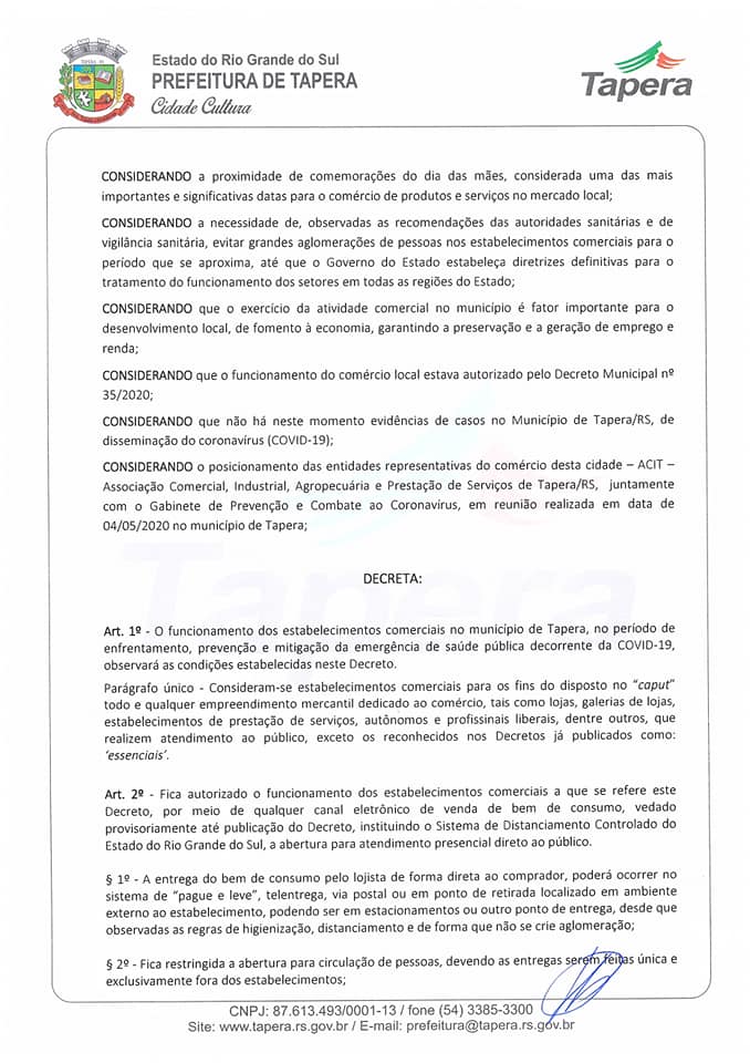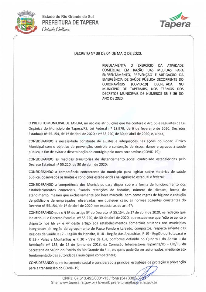 Diante do novo decreto nº 55.2020, de 30 de abril, do Governo do Estado, a Prefeitura Muncipal de Tapera edita o decreto nº 39, de 04 de maio de 2020, com as novas medidas adotadas pelo Município contra a disseminação da Covid-19.