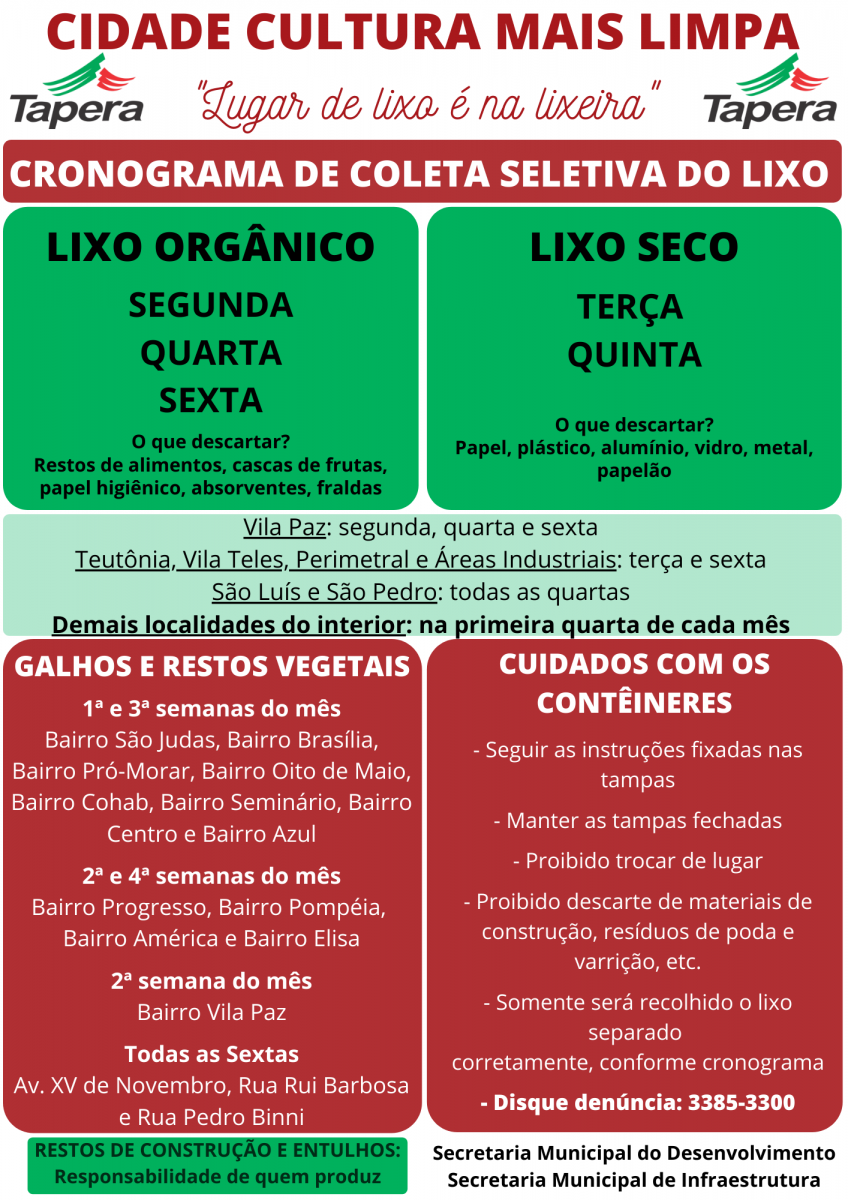 As Secretarias Municipais do Desenvolvimento e Infraestrutura, solicitam a comunidade que o cronograma de recolhimento do lixo seja respeitado, gerando benefícios à população e ao meio ambiente. Ressalta-se que é importante não descartar lixo durante o final de semana (recolhimento só é realizado em dias úteis), evitando transtornos, pede-se também para que a população leve o lixo até os contêineres, facilitando o trabalho dos garis e evitando acúmulo de lixo nas ruas.