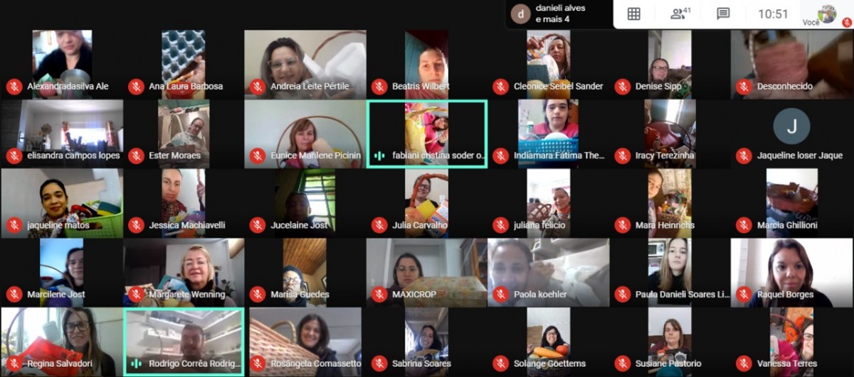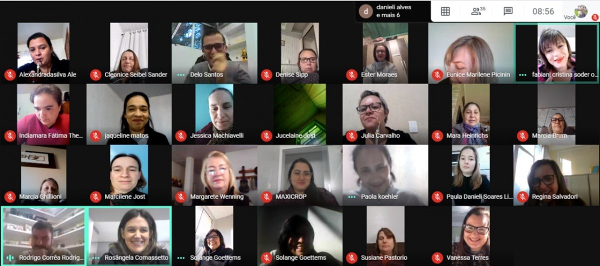 Na manhã da quinta-feira, 28/05 foi realizado um encontro virtual, através do Google Meet, de todas as Auxiliares de Ensino, supervisoras da Educação Infantil e coordenação pedagógica da SMECDL com os assessores pedagógicos do Programa PUFV, Rodrigo Correa, Rita Vargas e Rosângela Comassetto. O encontro faz parte das 40h anuais de capacitação oferecida para as Auxiliares de Ensino.