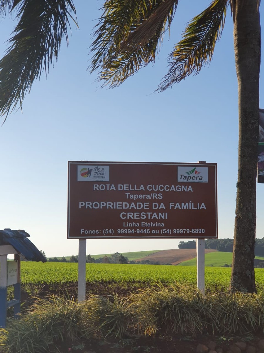 Durante esta semana, concluiu-se a instalação de placas de sinalização para o Roteiro Turístico Municipal Rota Della Cuccagna. Ao todo, foram instaladas 8 placas próximas aos pontos turísticos quem compõem a Rota, sendo eles, Gruta Nossa Senhora de Lourdes, Orquidário San Sebastian, Trattoria Bella Itália, Propriedade da Família Crestani, Camping Gota d´Água e Casa do Vinho Rizzi. Uma placa também foi instalada na Trilha Ecológica da Escola Costa e Silva, localizada no Bairro Brasília. Para o Secretário Municipal do Desenvolvimento Luiz Guilherme Roethig ?A colocação destas placas é uma das metas do Plano Municipal de Turismo e possui por objetivo fomentar o turismo local, através da identificação de pontos turísticos importantes?.
