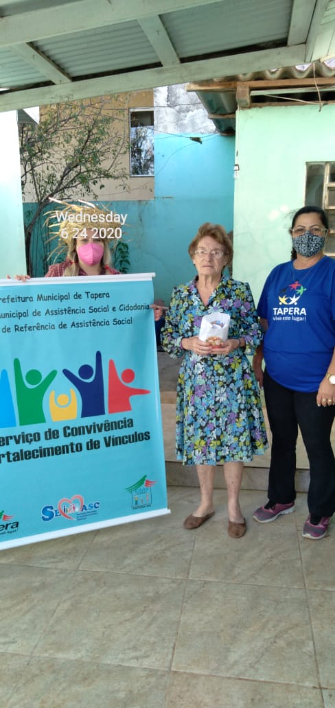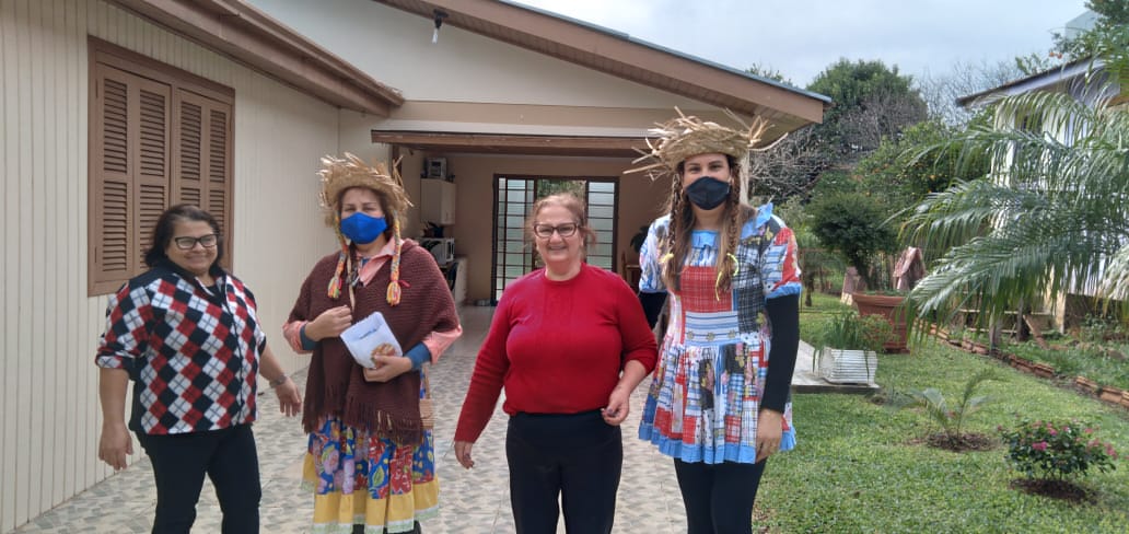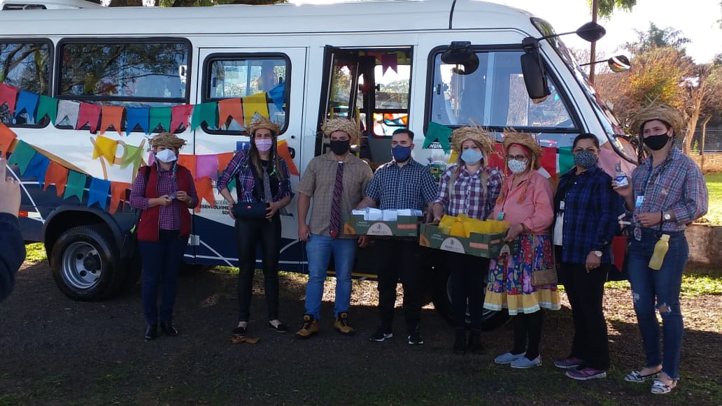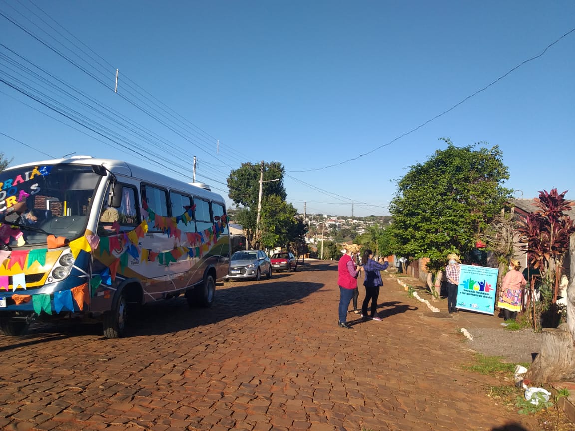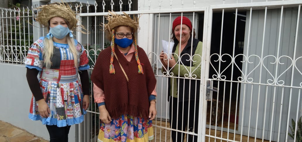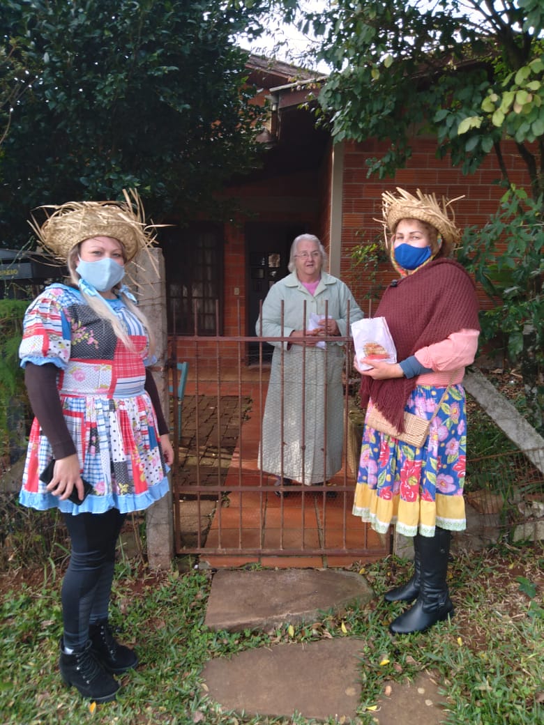 Para as crianças e jovens, os familiares retiraram no CRAS e os grupos da 3° Idade recebem em casa, com uma surpresa: a equipe do CRAS com o ônibus todo enfeitado, levaram de casa em casa o pacote com as iguarias. Tudo com muita alegria, música e carinho para os vovôs e vovós. A Primeira Dama do Município Marilei Borghetti Kuhn participou da atividade.