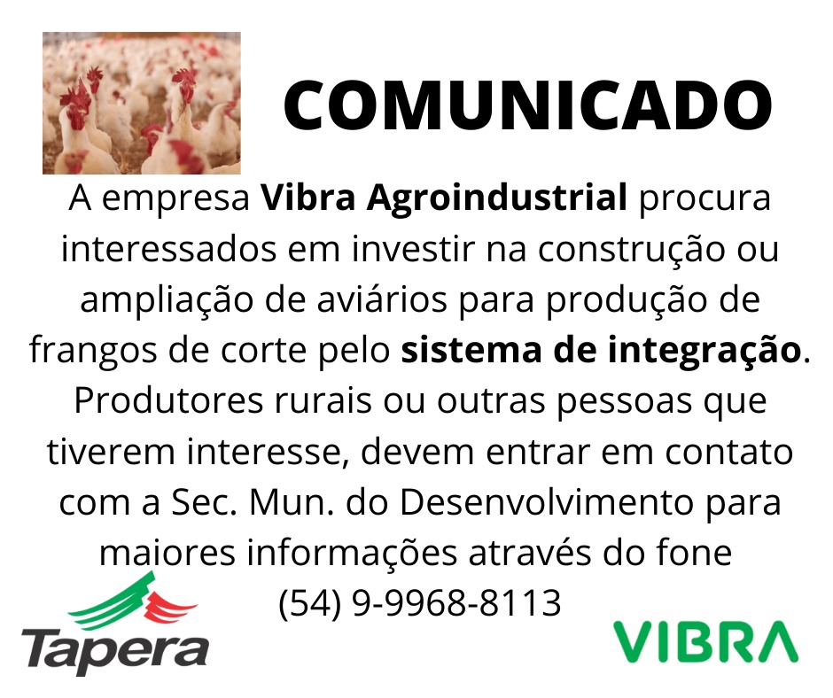 A empresa esteve visitando a Secretaria Municipal do Desenvolvimento na última semana e está à procura de produtores rurais ou outras pessoas interessadas em investir na produção de frangos de corte (CONSTRUÇÃO DE AVIÁRIOS).