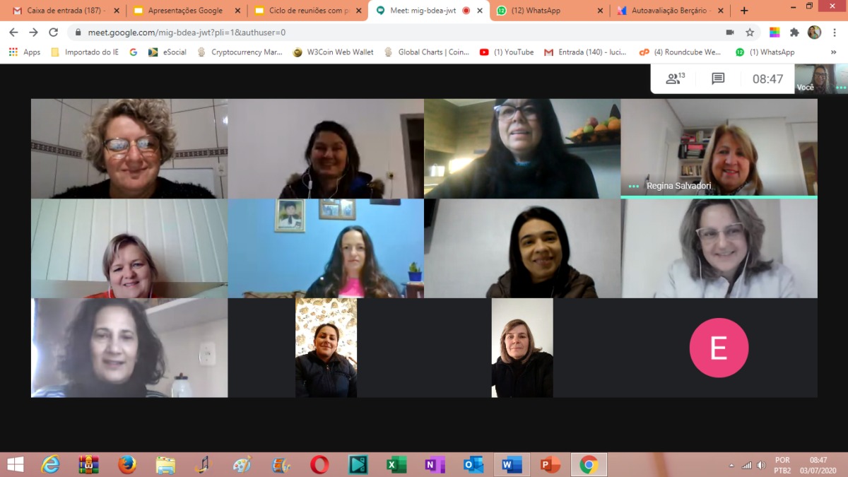 As reuniões acontecem inicialmente por turmas da Educação infantil ao Pré B e também do primeiro ao quinto ano. Em seguida serão feitas em função de cada componente curricular. ?Tem sido um trabalho árduo, através do qual podemos olhar o trabalho de cada professor. Tem havido muita escuta e empatia sobre o trabalho que cada qual tem conseguido realizar?, observa a coordenadora pedagógica prof. Lucimar Karpe Kanova. O ciclo se estenderá até o final do mês de julho.