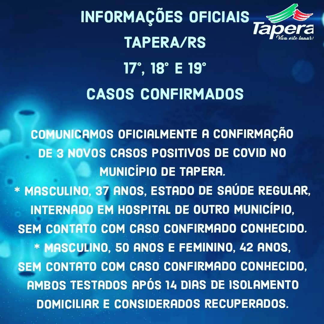 Tapera apresenta mais três casos de Covid 19Tapera apresenta mais três casos de Covid 19
