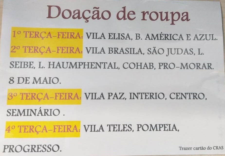 A Secretaria informa que durante o mês de agosto não haverá a distribuição normal. As pessoas que necessitarem deverão entrar em contato direto com as funcionárias do CRAS para serem atendidas. A partir do mês de setembro a distribuição voltará a ser feita de acordo com o cronograma por bairros.