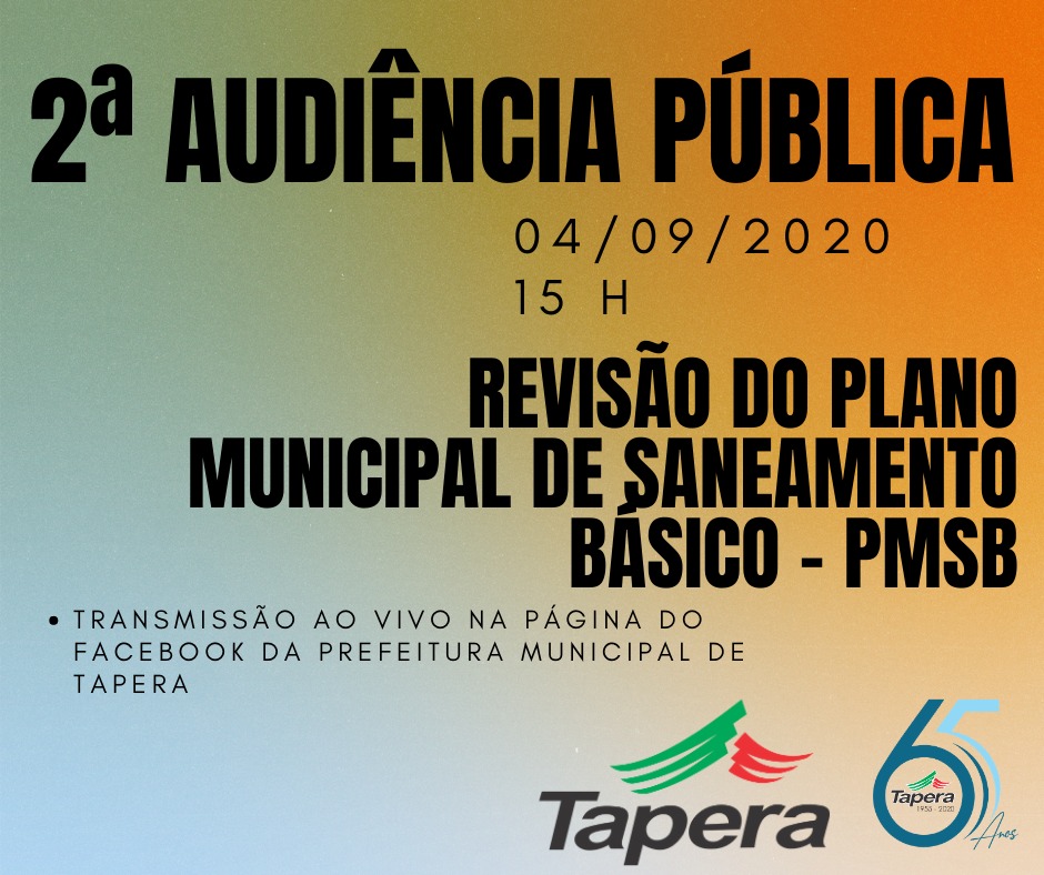 No dia 04/09, sexta-feira, às 15h, ocorrerá a segunda audiência pública referente a revisão do Plano Municipal de Saneamento Básico ? PMSB. O encontro será virtual e a comunidade poderá acompanhar a Audiência Pública pela página do facebook da Prefeitura de Tapera.
