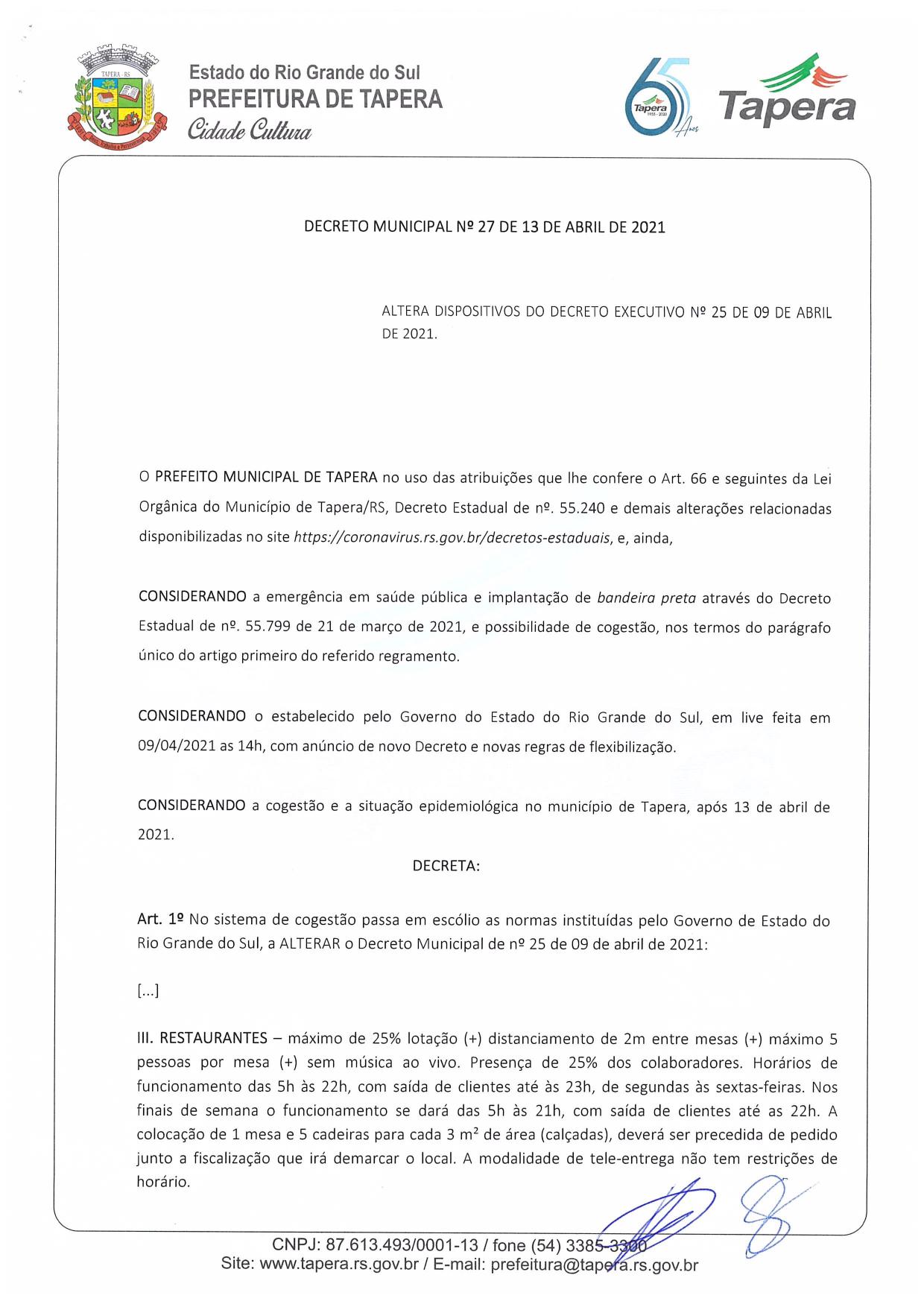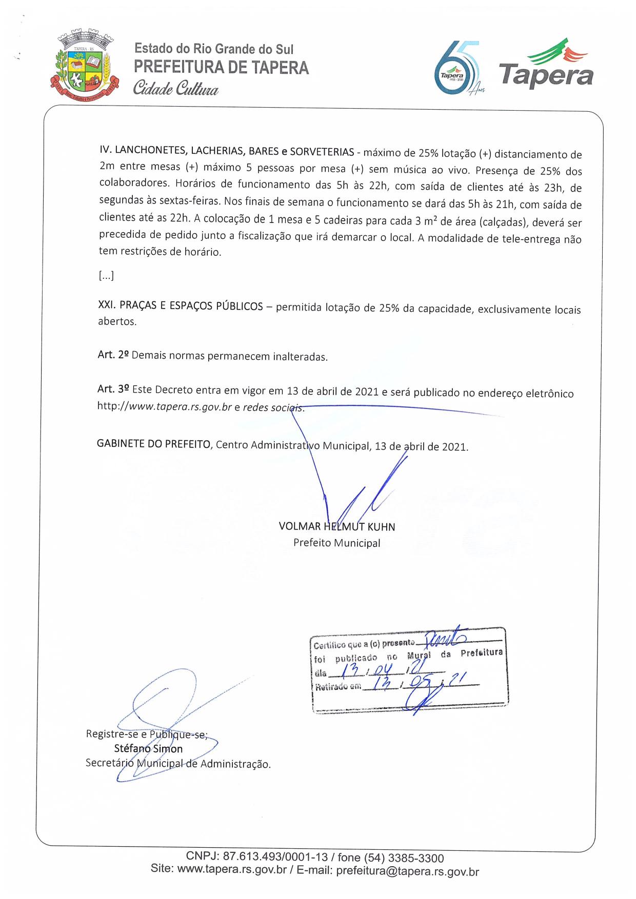 Na tarde desta terça feira, 13 de abril, o Prefeito Volmar emitiu um novo decreto municipal.