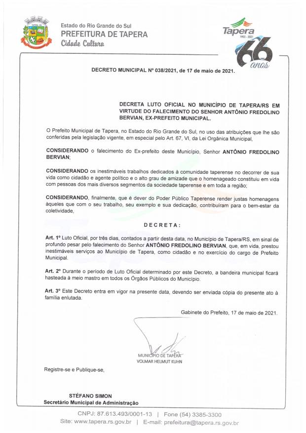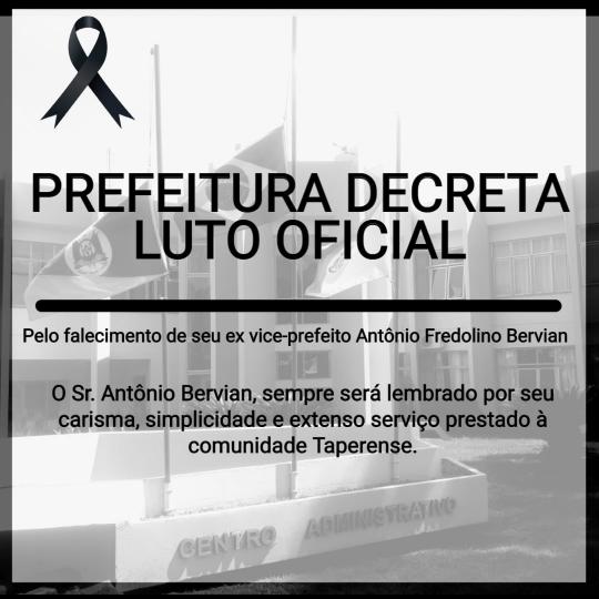 A Administração Municipal de Tapera declarou nesta segunda feira (17) luto oficial, de três dias, pelo falecimento do ex Vice-Prefeito Antônio Fredolino Bervian.
