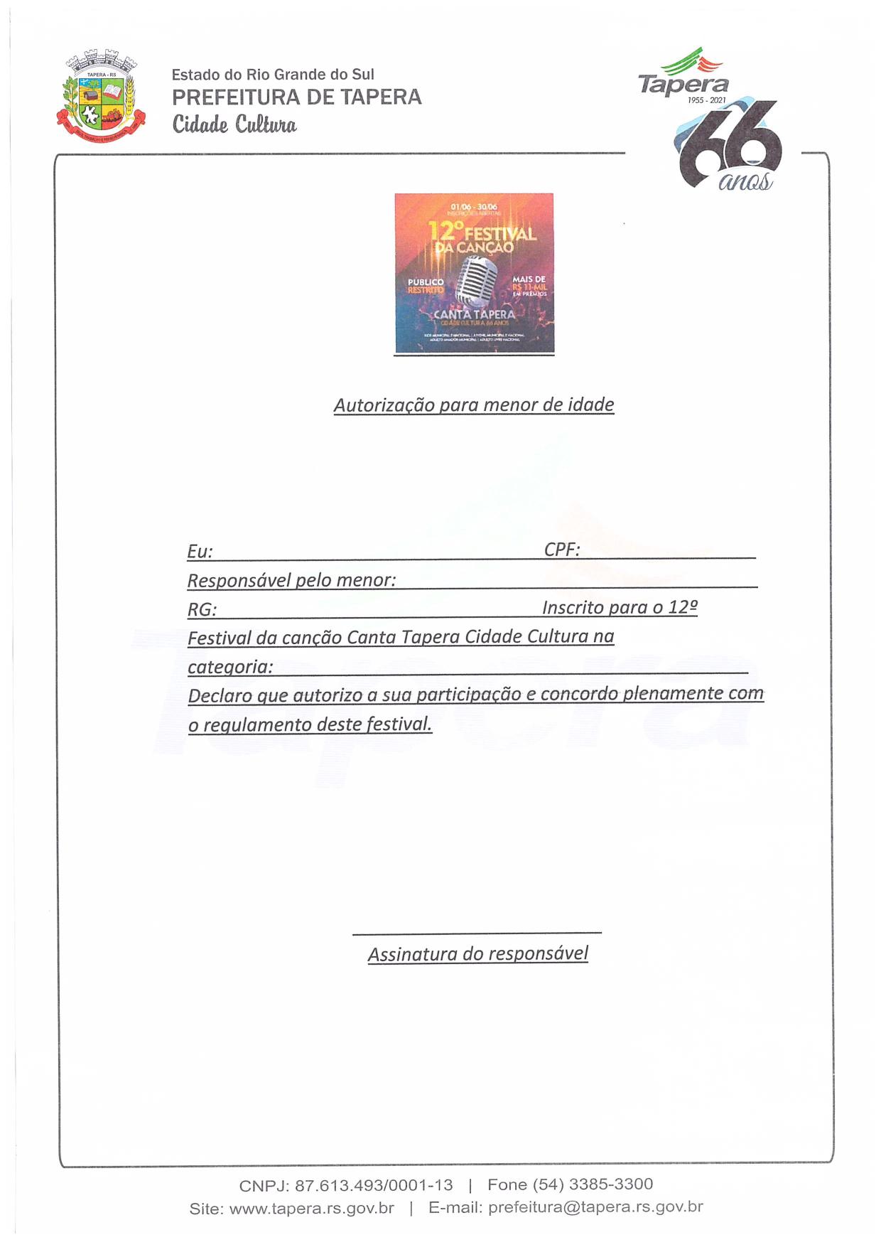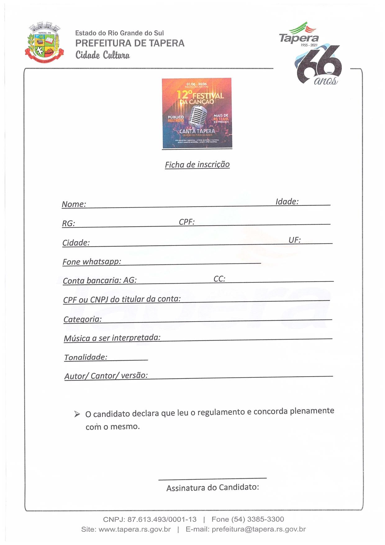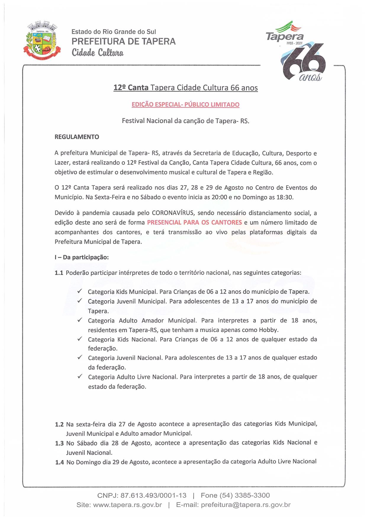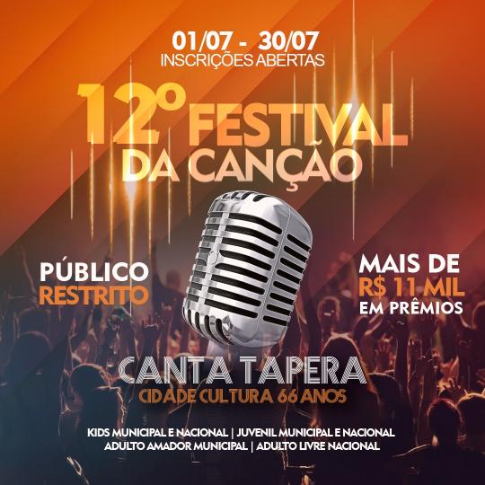 A Prefeitura Municipal de Tapera, através da Secretaria de Educação, Cultura, Desporto e Lazer, estará realizando o 12º Festival da Canção, Canta Tapera Cidade Cultura, 66 anos, com o objetivo de estimular desenvolvimento musical e cultural de Tapera e região.