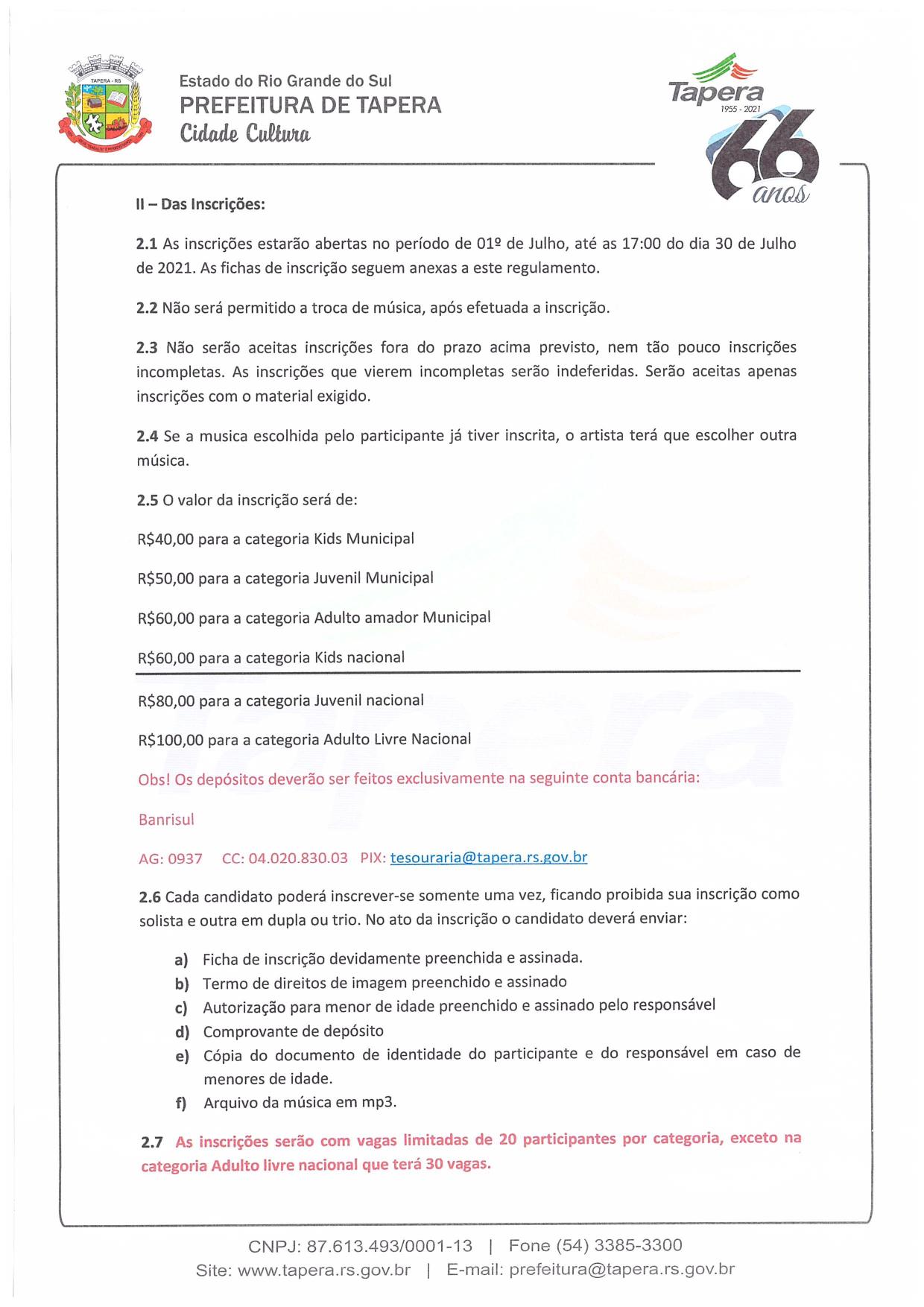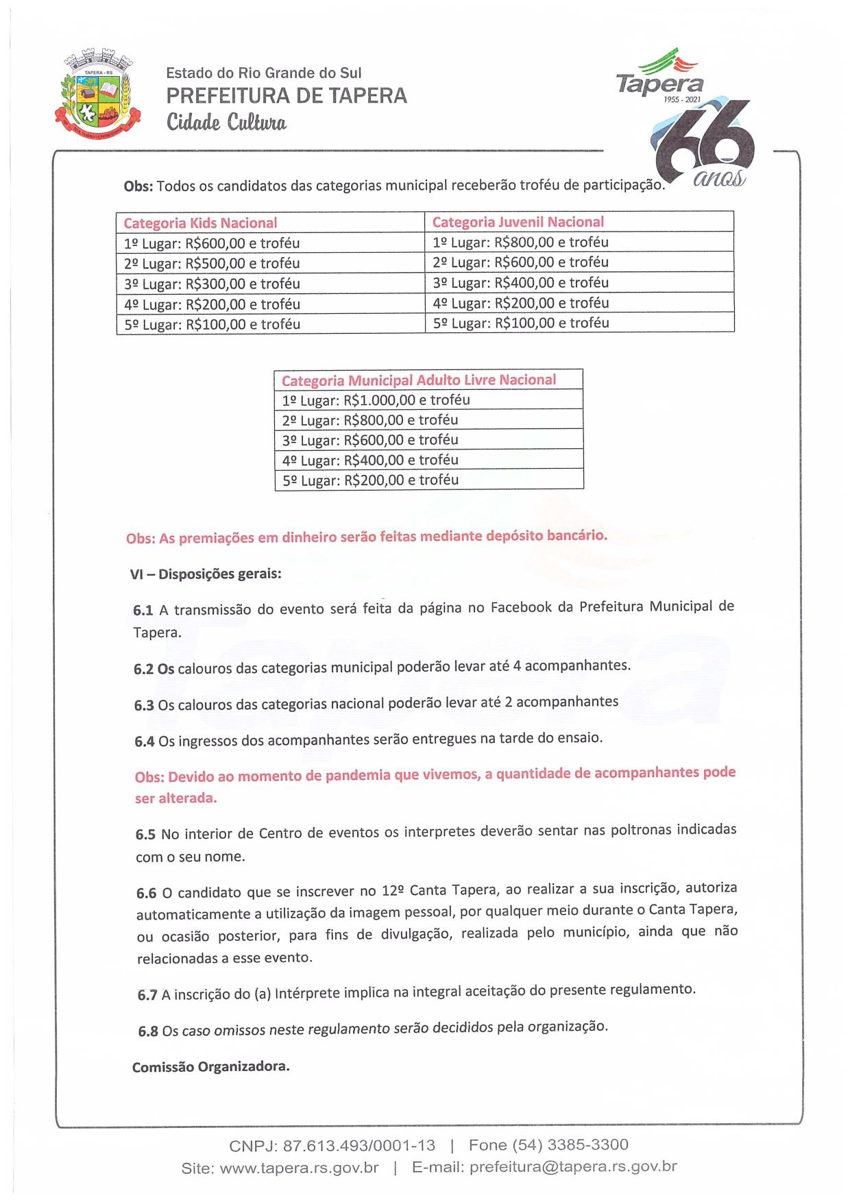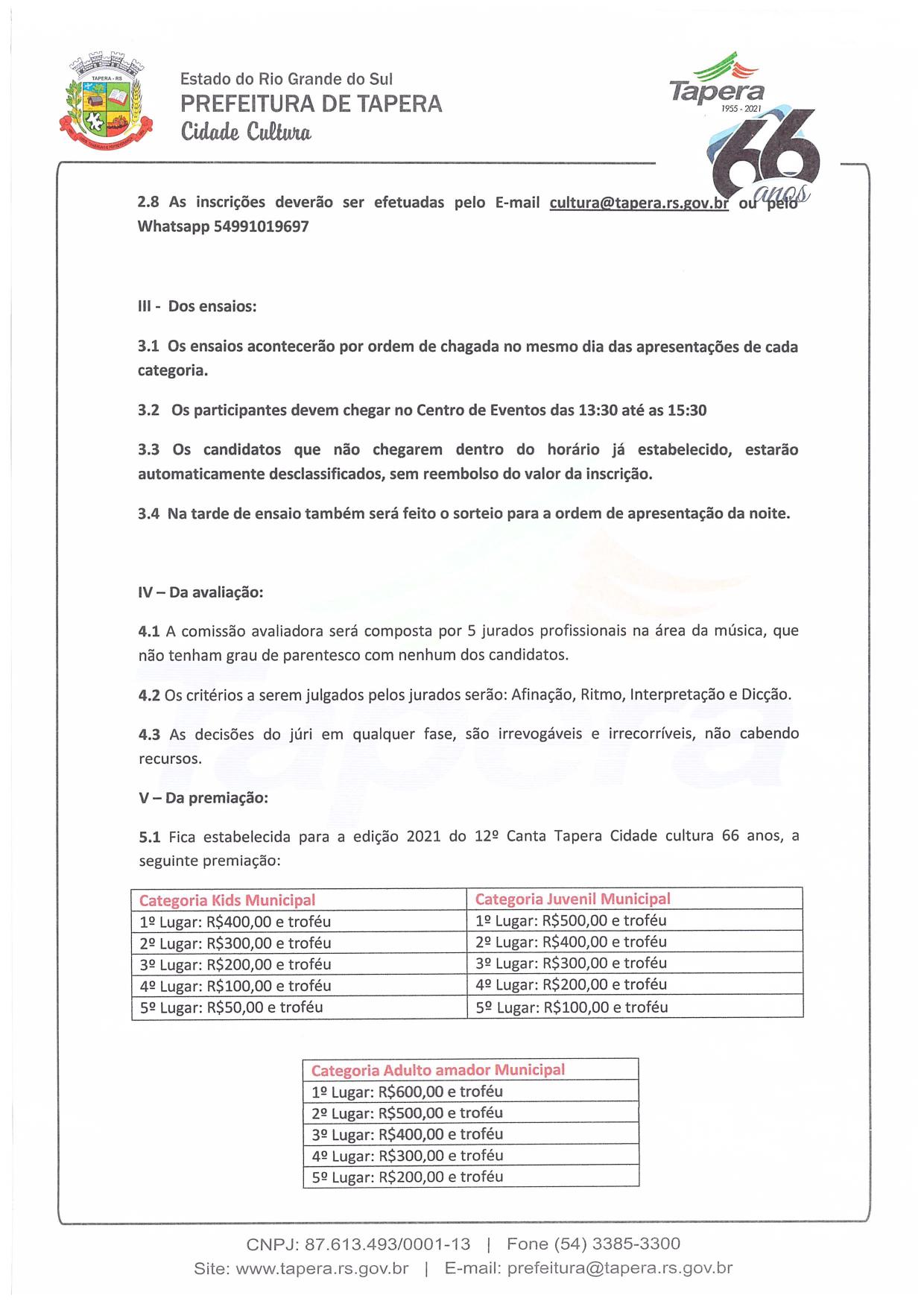 A Prefeitura Municipal de Tapera, através da Secretaria de Educação, Cultura, Desporto e Lazer, estará realizando o 12º Festival da Canção, Canta Tapera Cidade Cultura, 66 anos, com o objetivo de estimular desenvolvimento musical e cultural de Tapera e região.
