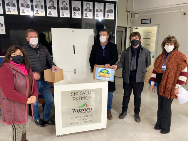 Na tarde do dia 30 de junho, às 14h no Centro Administrativo,foi realizado o primeiro sorteio da Campanha Show de Prêmios de Tapera. A entrega da premiação ocorrerá no dia 05/07 as 8.30h no Gabinete do Prefeito, para os seguintes contemplados: