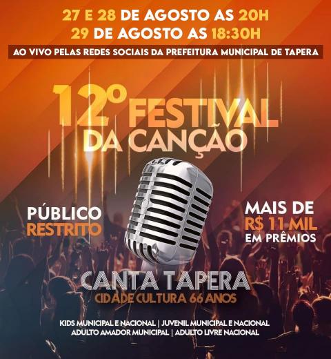 A Prefeitura Municipal de Tapera, através da Secretaria de Educação, Cultura, Desporto e Lazer, estará realizando o 12º Festival da Canção, Canta Tapera Cidade Cultura, 66 anos.