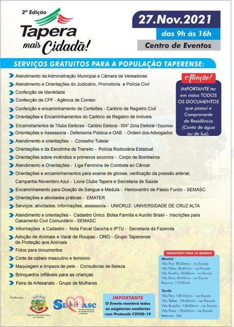 Acompanhe os Serviços que estarão sendo disponibilizado à População Taperense no dia 27/11/21.