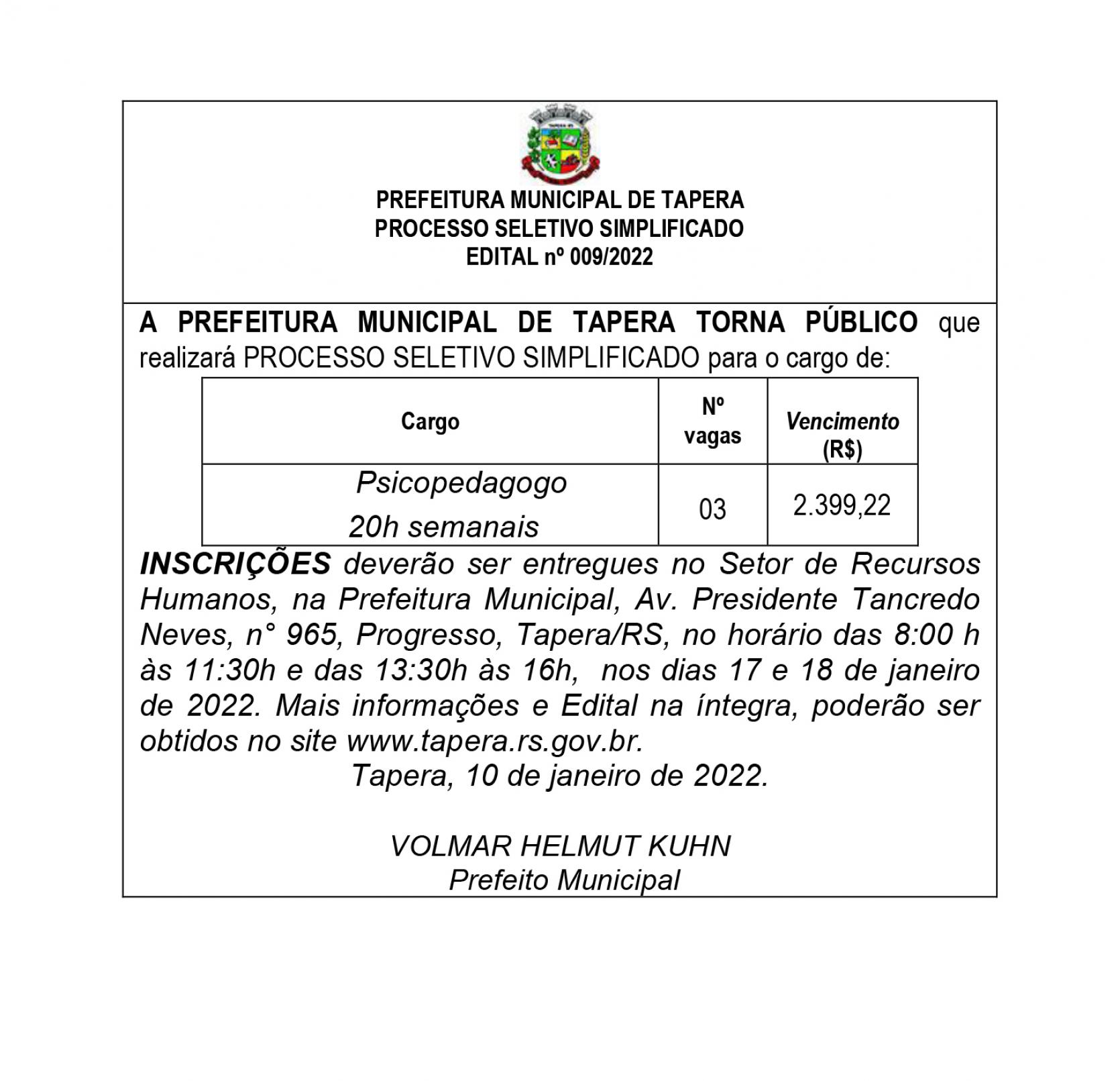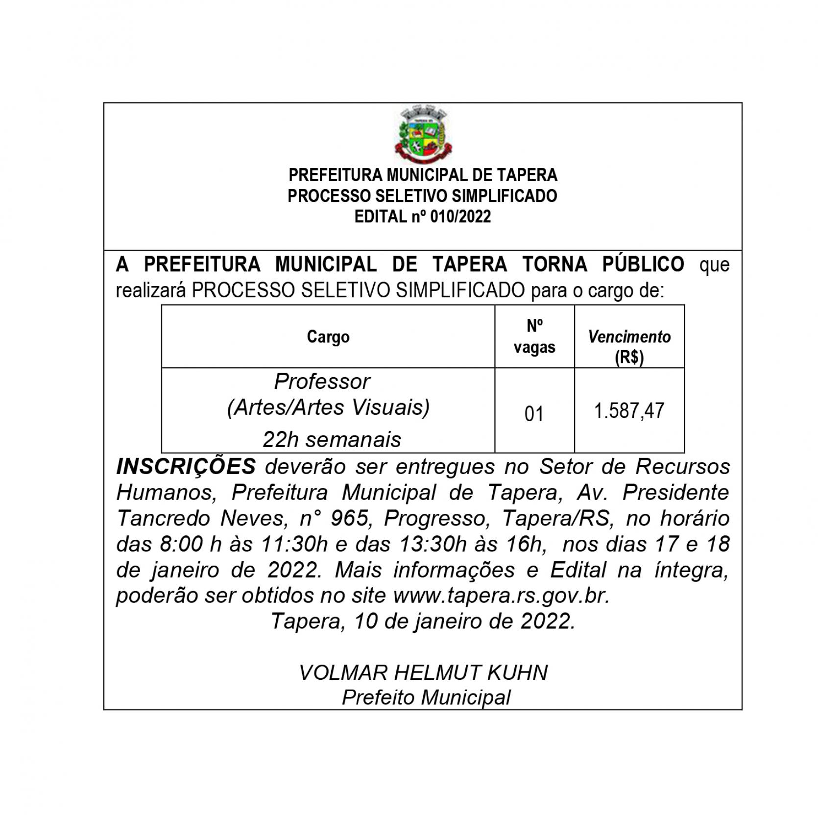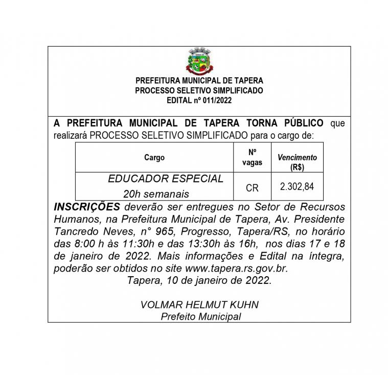 A Prefeitura Municipal de Tapera abriu processo seletivo simplificado para os cargos de psicopedagogo, educador especial e professor de artes. Os candidatos deverão apresentar a documentação no Setor de Recursos Humanos, nos dias 17 e 18 de janeiro.