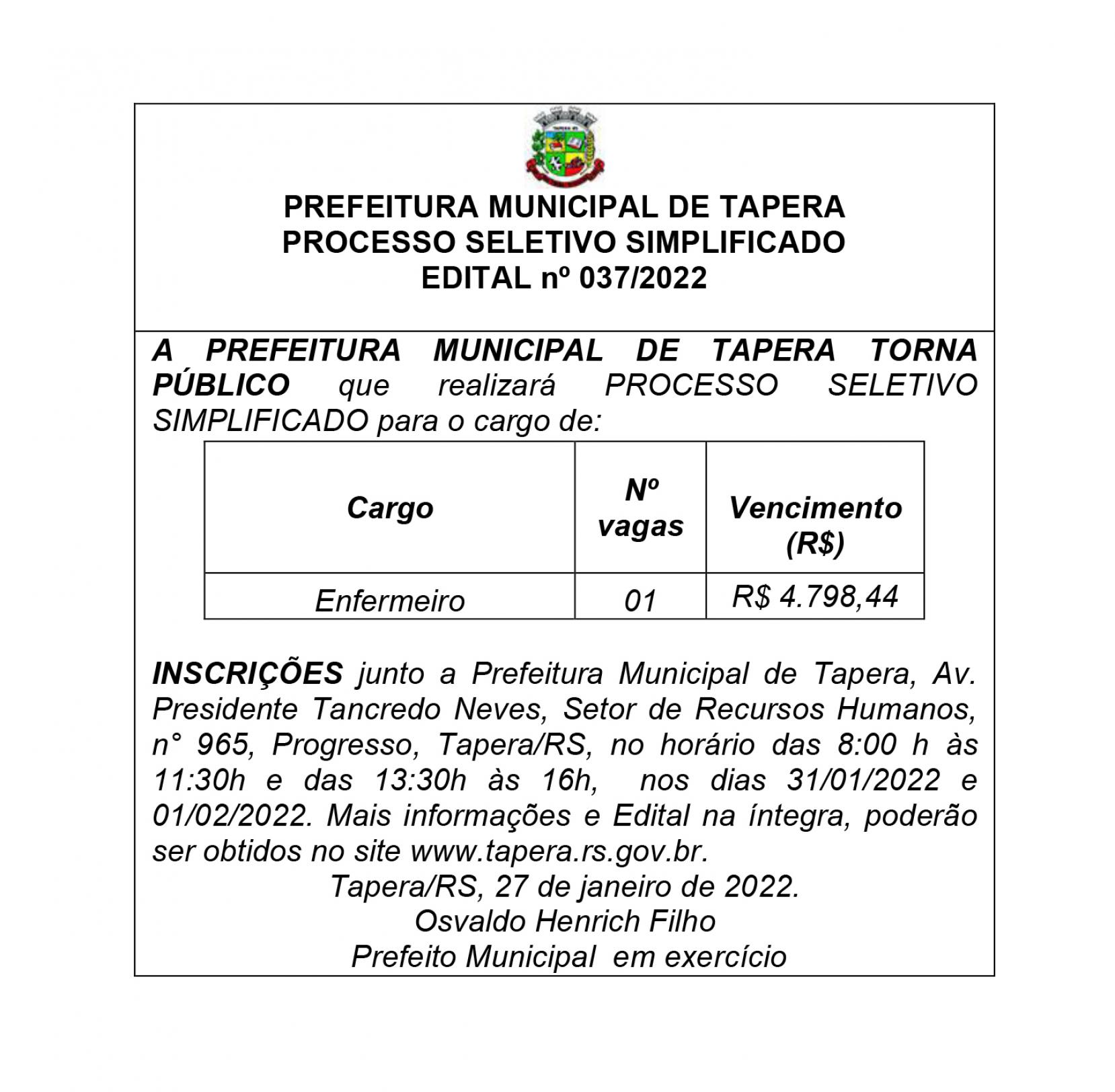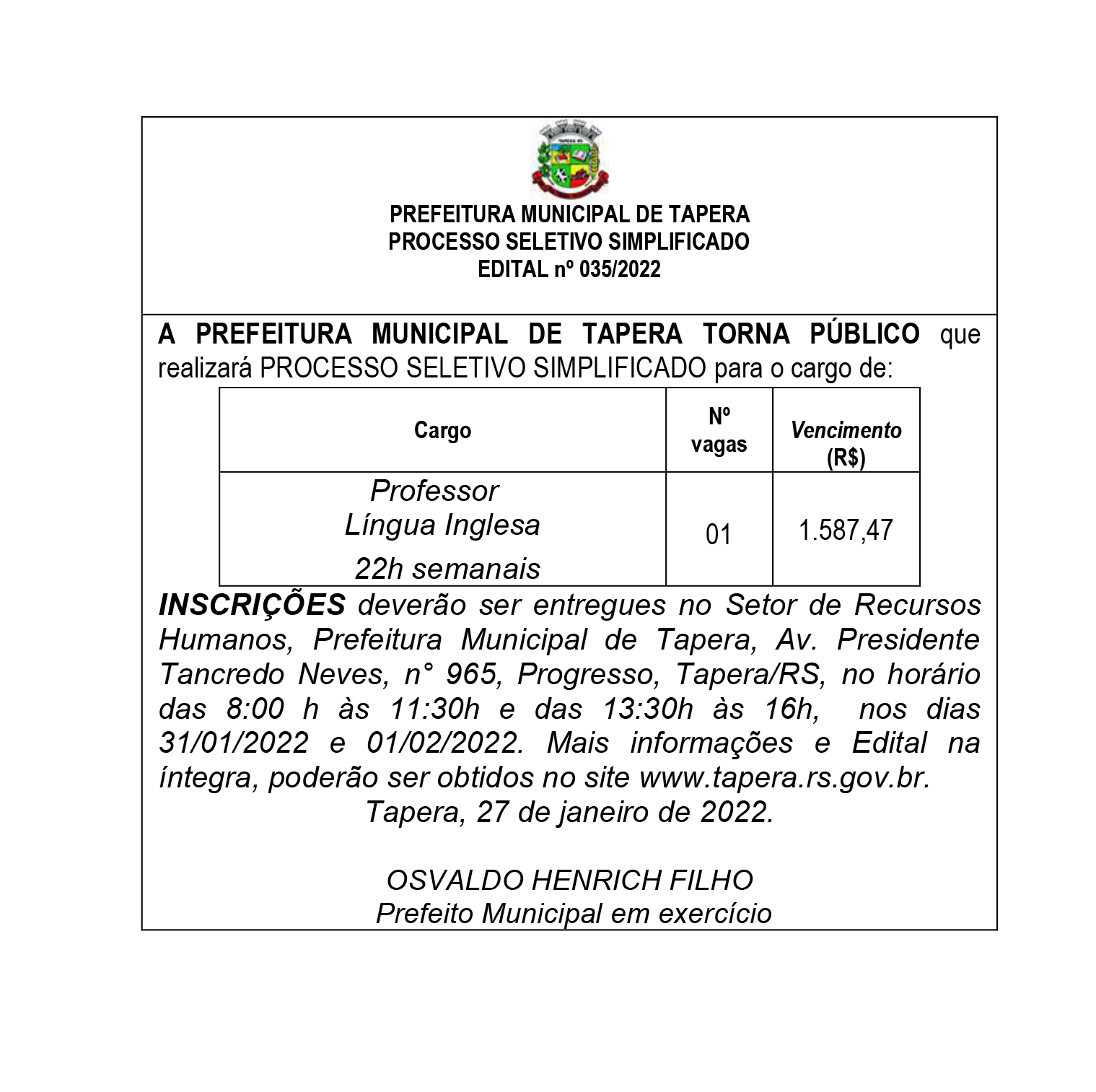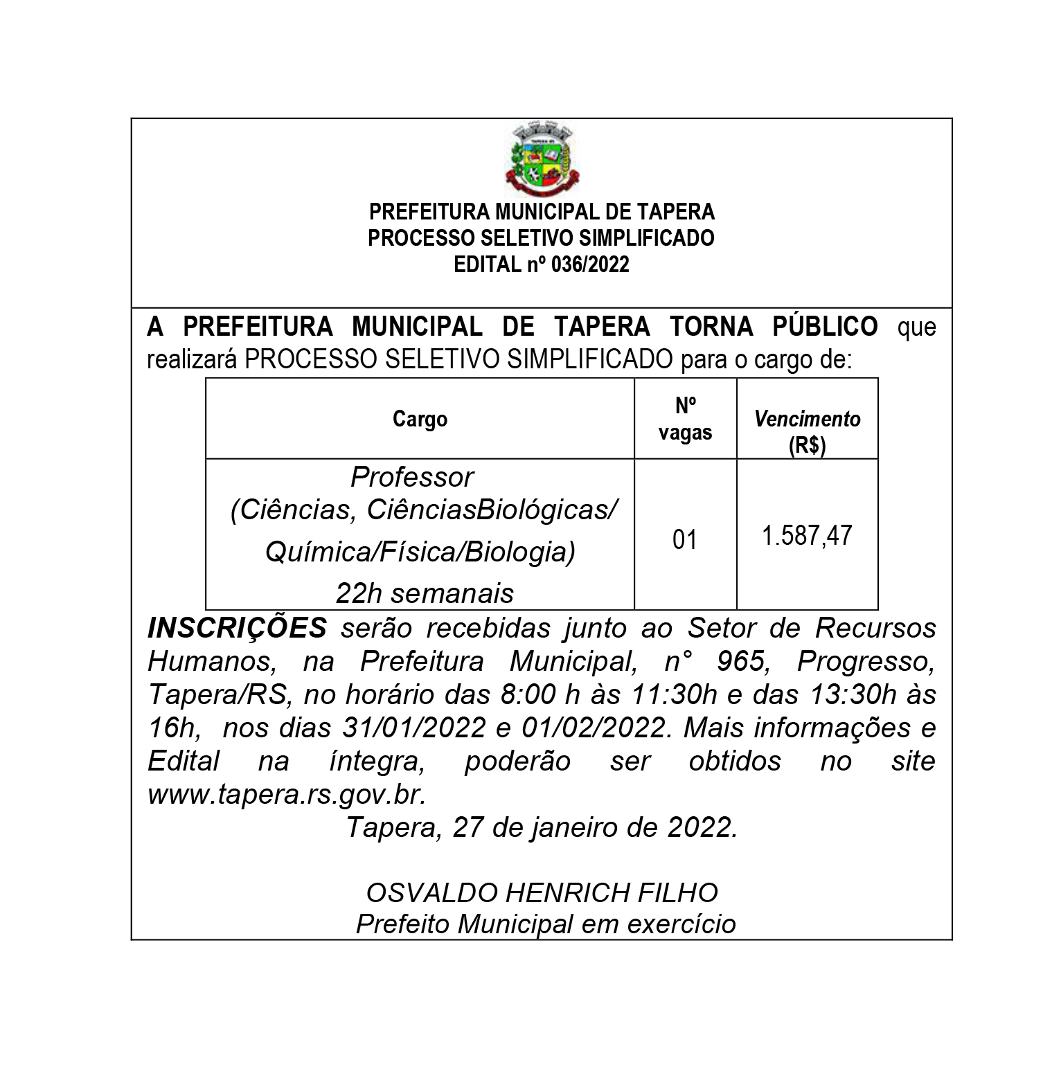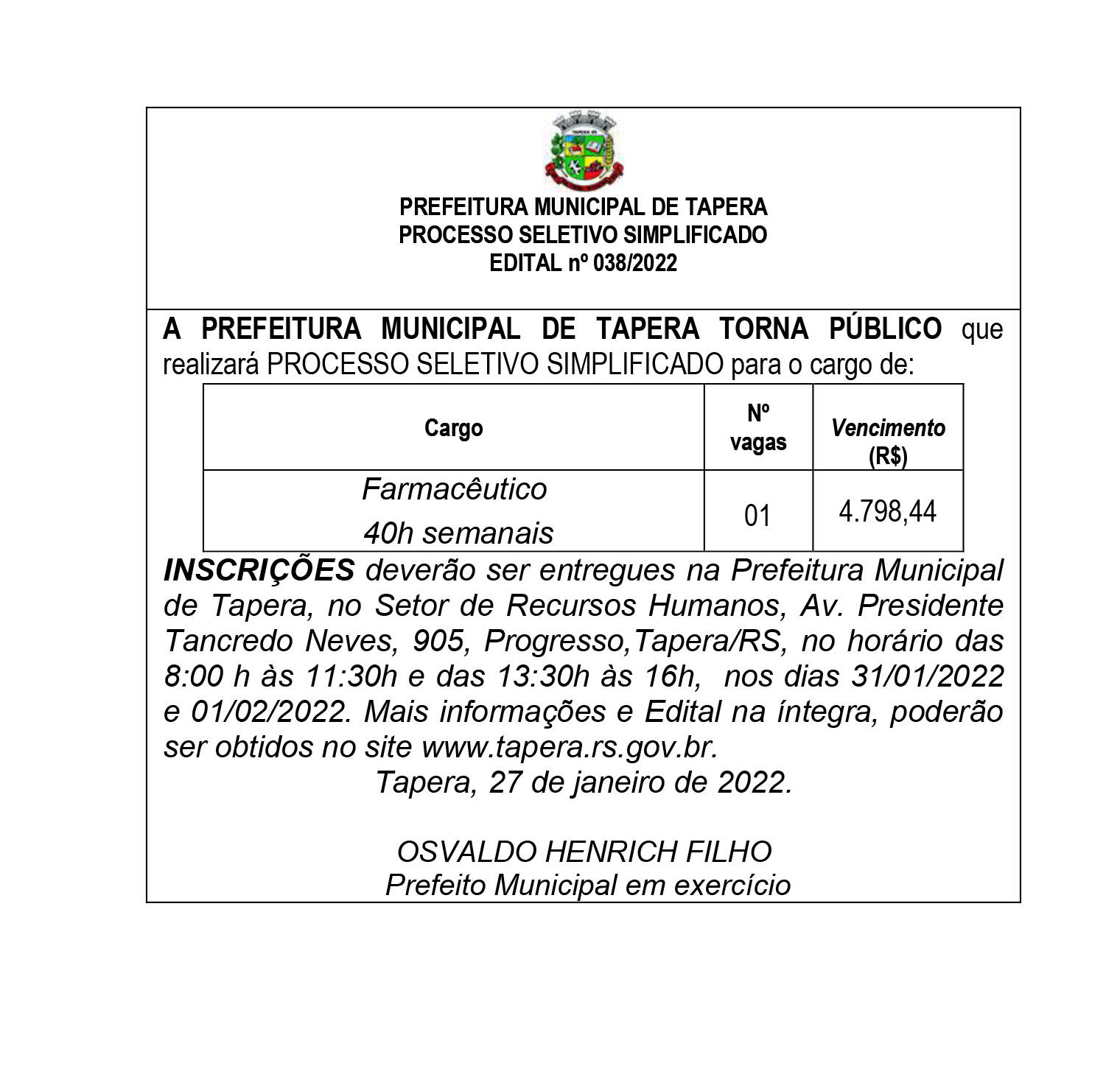 A Prefeitura Municipal de Tapera realizará processo seletivo simplificado para os cargos de Farmacêutico, Professor de Língua Inglesa, Professor de Ciências Biológicas e Enfermeiro. Os candidatos deverão entregar a documentação necessária no Setor de Recursos Humanos, nos dias 31/01 (segunda-feira) e 01/02 (terça-feira), das 8h às 11h30 e das 13h30 às 16h. Mais informações nos editais publicados no site www.tapera.rs.gov.br.