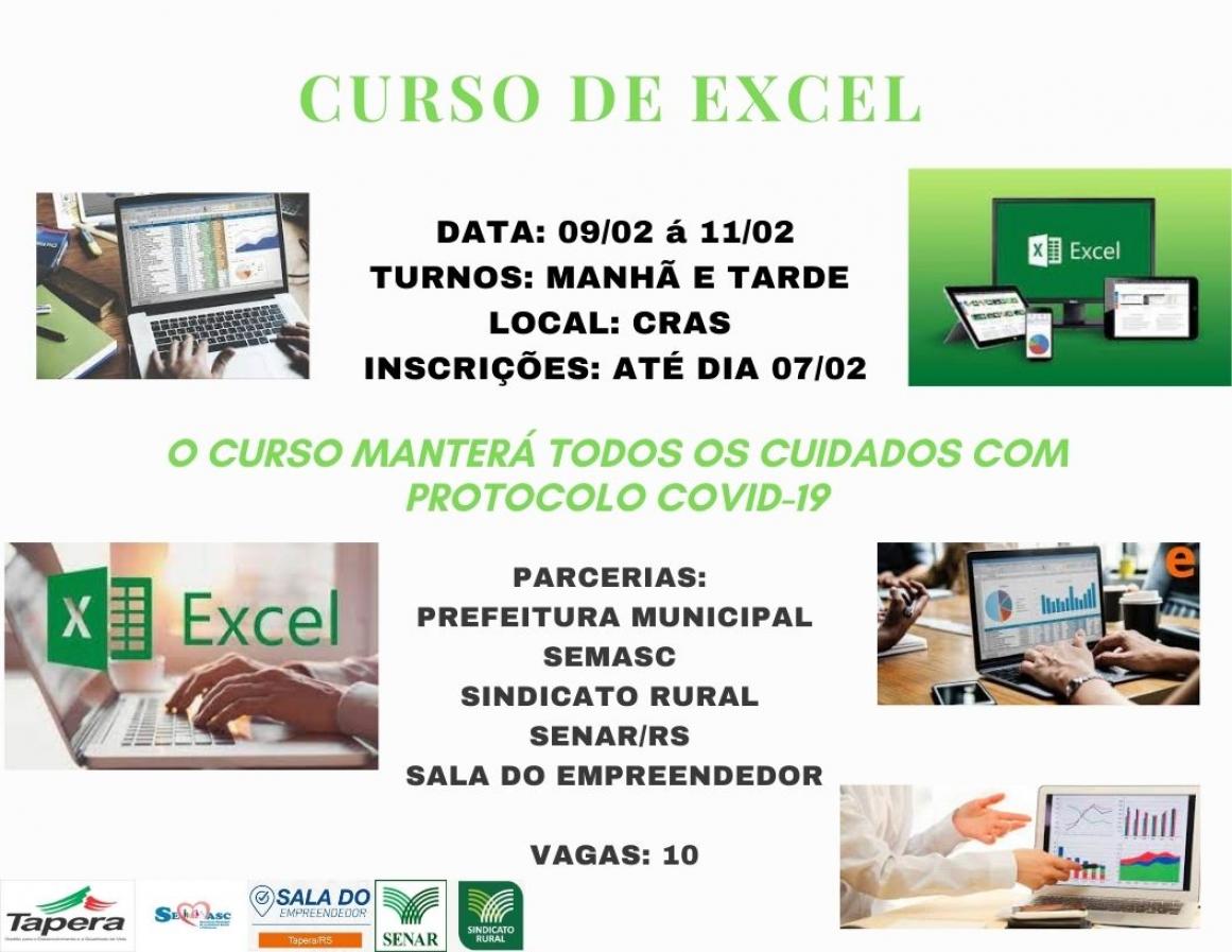 Inicia na próxima semana o curso de Excel. As inscrições são limitadas e podem ser feitas no CRAS. As aulas acontecerão entre os dias 9 e 11 de fevereiro, nos turnos da manhã e da tarde.