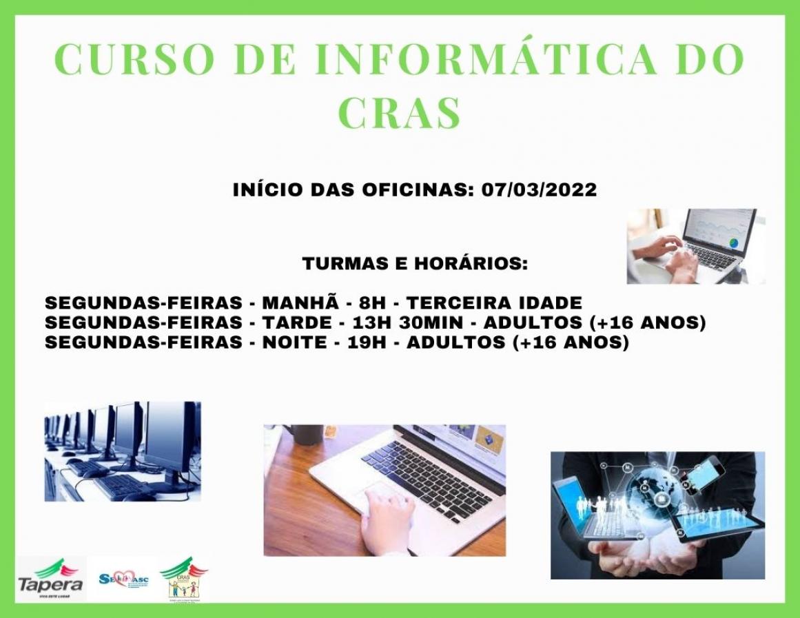 O curso de informática marcará o retorno das oficinas do CRAS. As incrições estão abertas. As aulas acontecerão nas segundas-feiras, em três turnos: pela manhã para a terceira idade, à tarde para adultos (+16 anos ) e à noite para adultos com idade acima de 16 anos. As atividades começarão em 07 de março. Mais informações na Secretaria Municipal de Assistência Social e Cidadania.