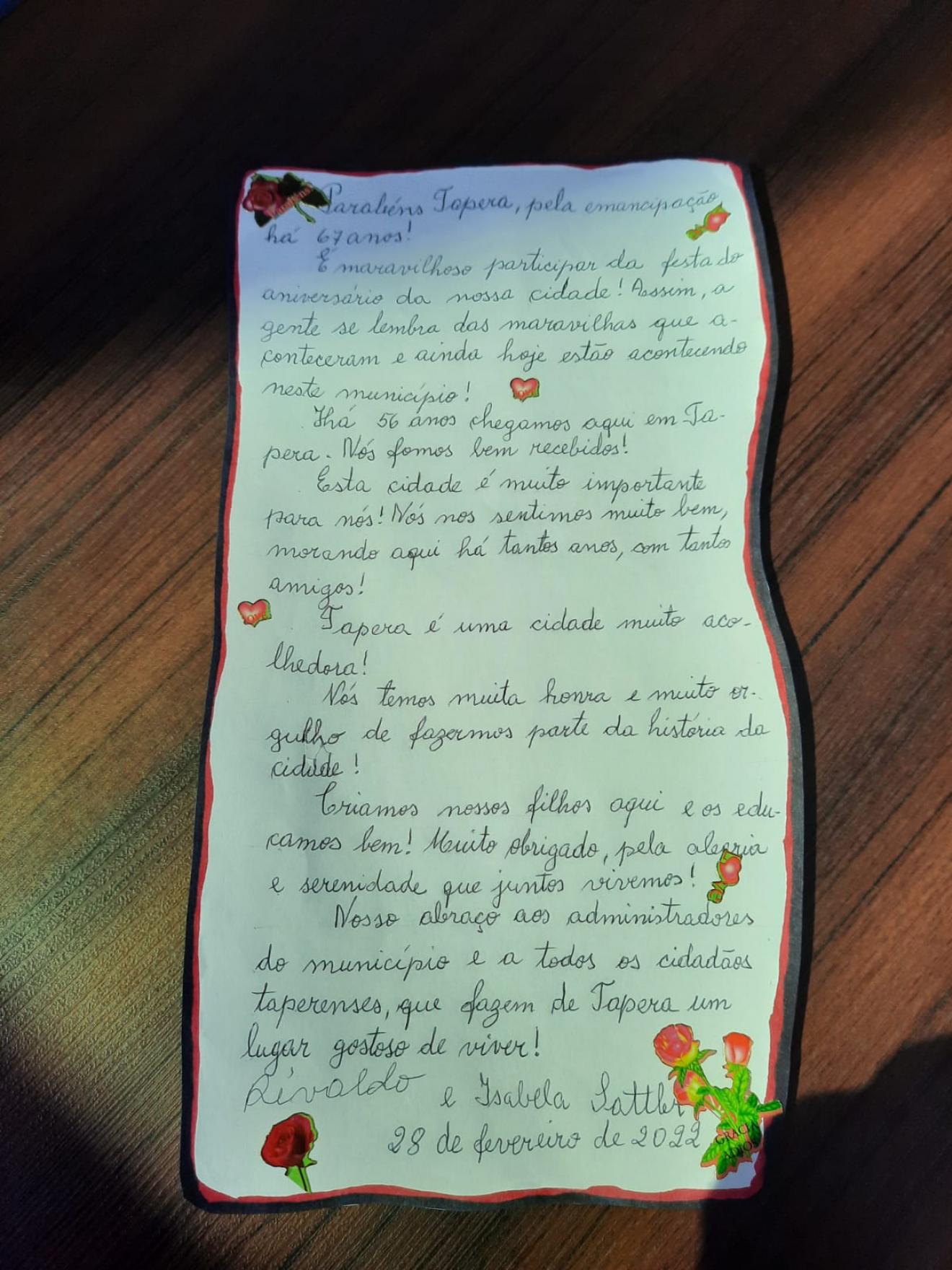 Na manhã desta quarta-feira, 02/03, Tapera recebeu uma linda orquídea e uma carta escrita à mão do casal Nivaldo e Isabela Sattler.