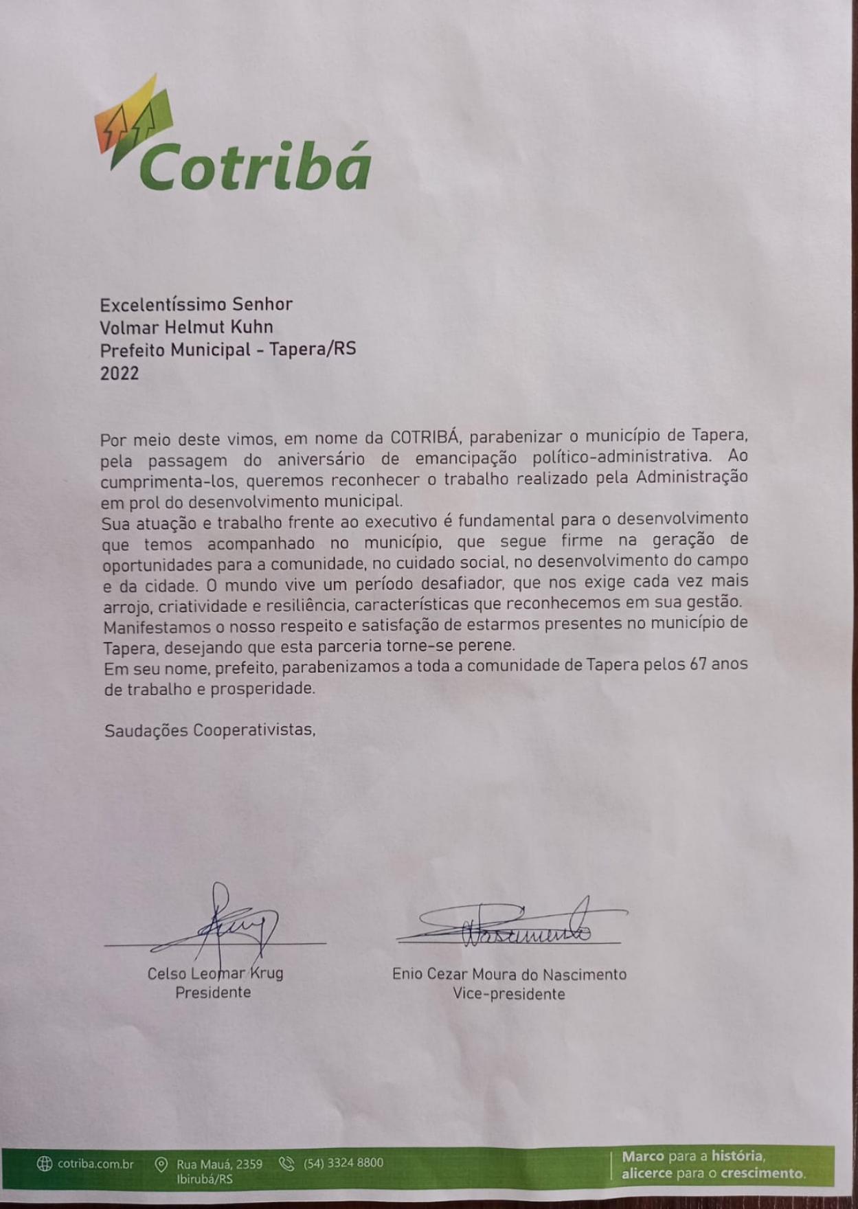 Tapera completou 67 anos de emancipação político-administrativa no dia 28 de fevereiro. A prefeitura de Ibirubá enviou um ofício parabenizando o município.