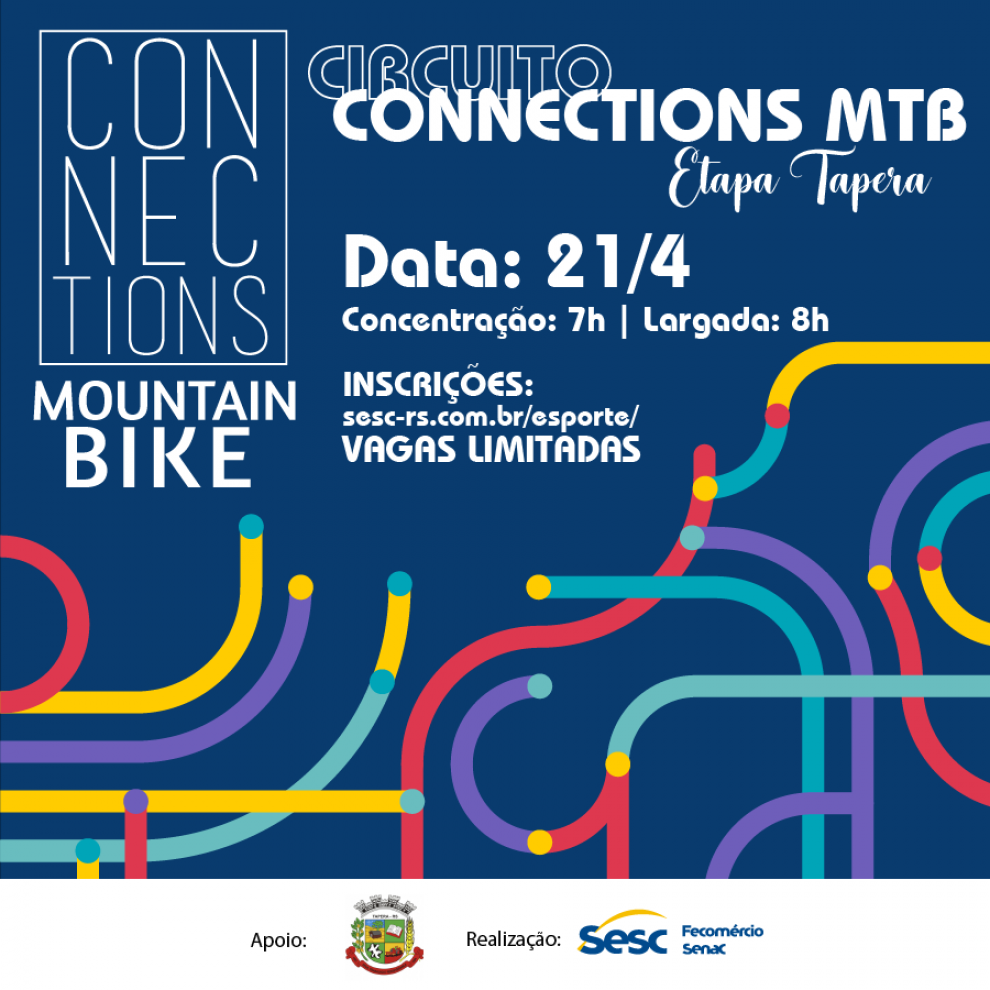 Estão abertas as inscrições para a 3ª etapa do Connections Sesc de Mountain Bike. As vagas são limitadas a 150 participantes. As inscrições devem ser realizadas até o dia 19, via site https://www.sesc-rs.com.br/esporte/ciclismo