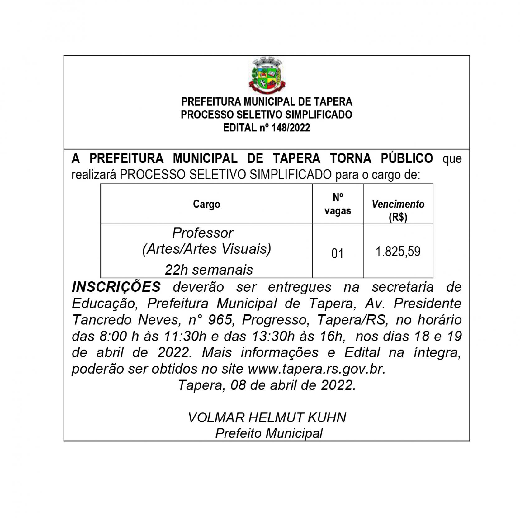 A Prefeitura Municipal de Tapera está com processo seletivo simplificado para o cargo de Professor de Artes/ Artes Visuais. A carga horária é de 22h e a remuneração de R$ 1.825,59.
