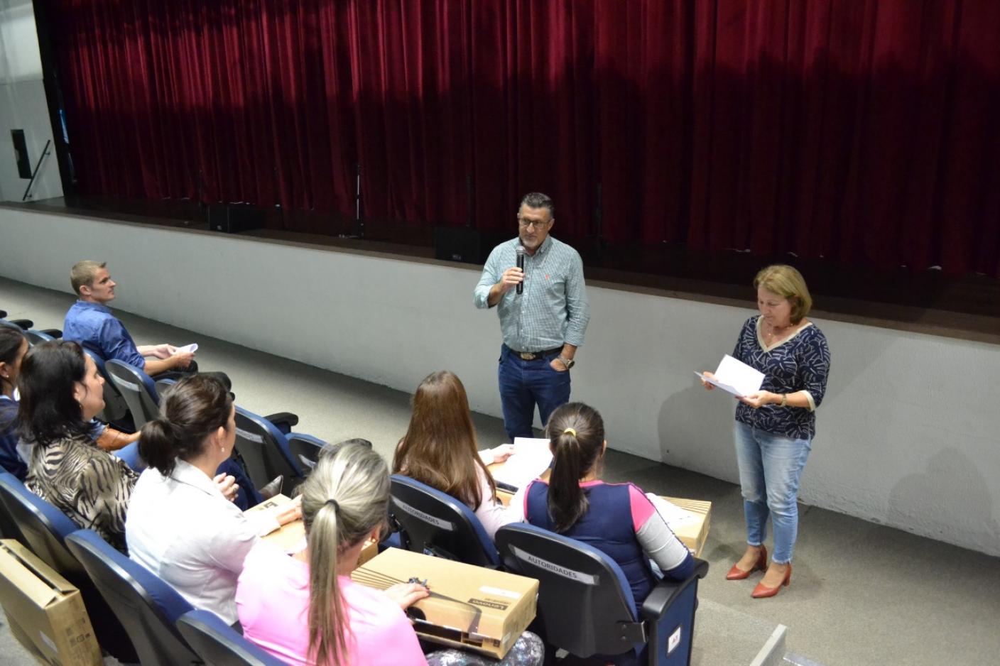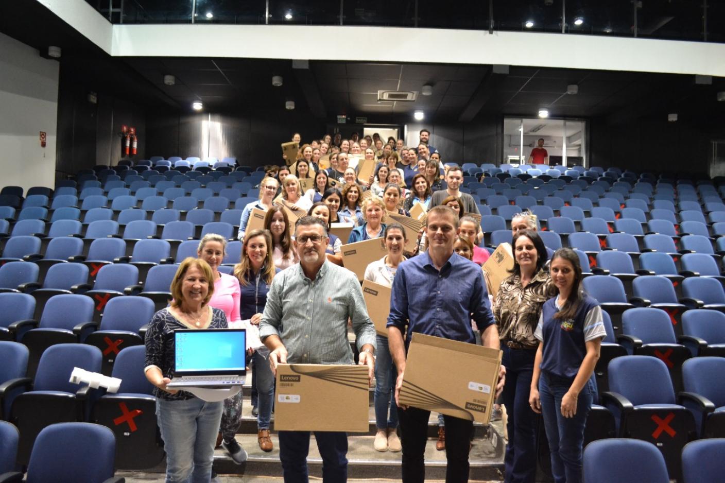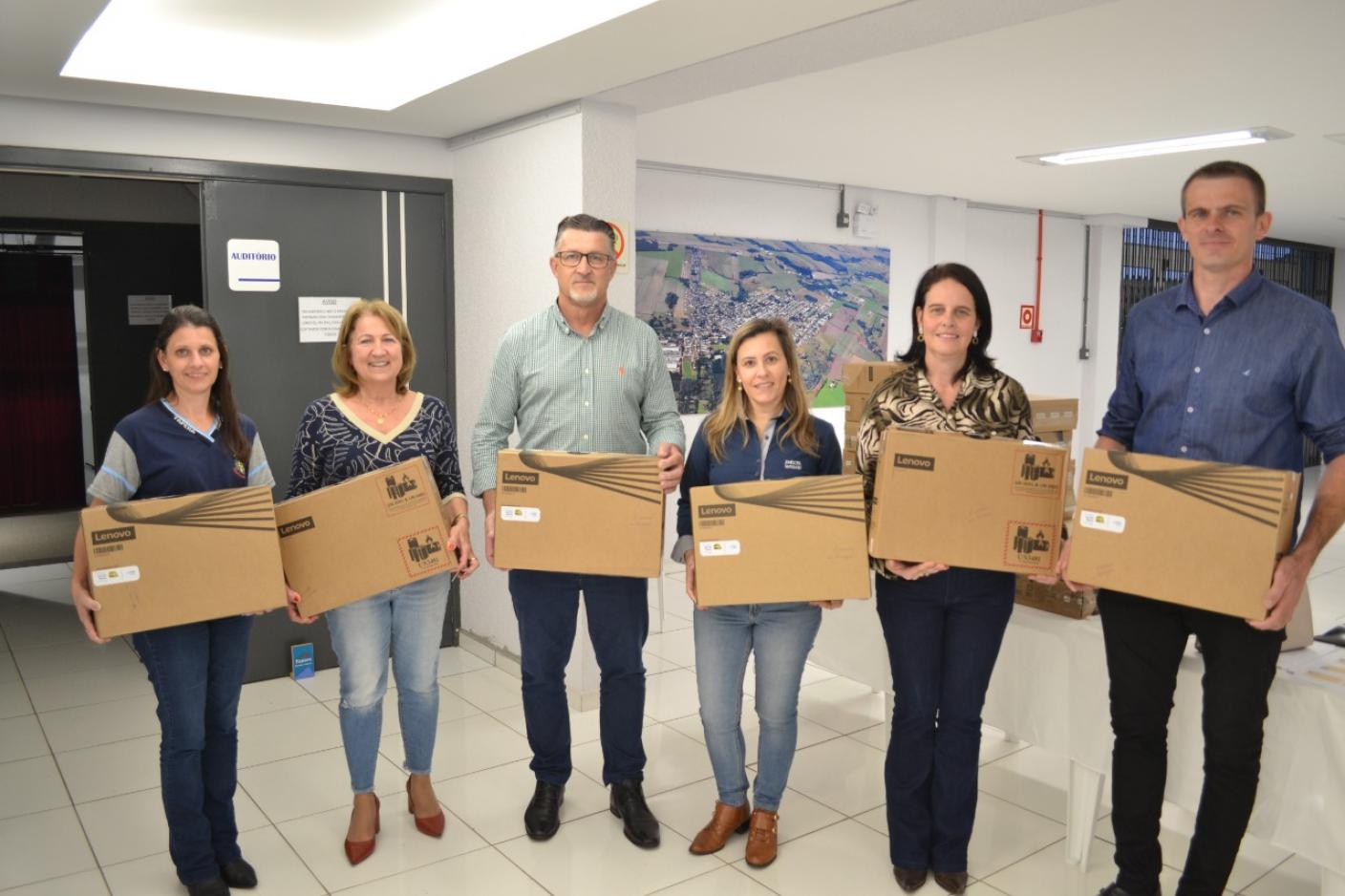 Os professores da rede municipal de Tapera receberam notebooks para modernizar o ensino. A entrega foi realizada no Centro de Eventos pelo prefeito Volmar Kuhn, secretária da Educação, Maria Regina Salvadori, Diretora do departamento da Educação, Verônica Spezia, Coordenadoras Pedagógicas Lucimara Karpe Canova e Sinara Salvadori da Costa, e Assessor de Informática, Leslei Lotterman.
