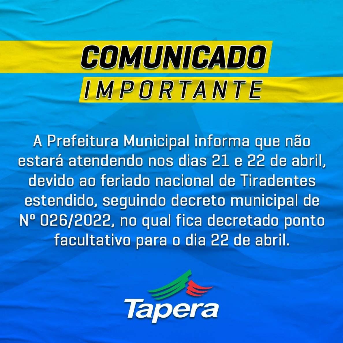 A Prefeitura Municipal informa que não estará atendendo nos dias 21 e 22 de abril, devido ao feriado nacional de Tiradentes estendido, seguindo decreto municipal de Nº 026/2022, no qual fica decretado ponto facultativo para o dia 22 de abril.