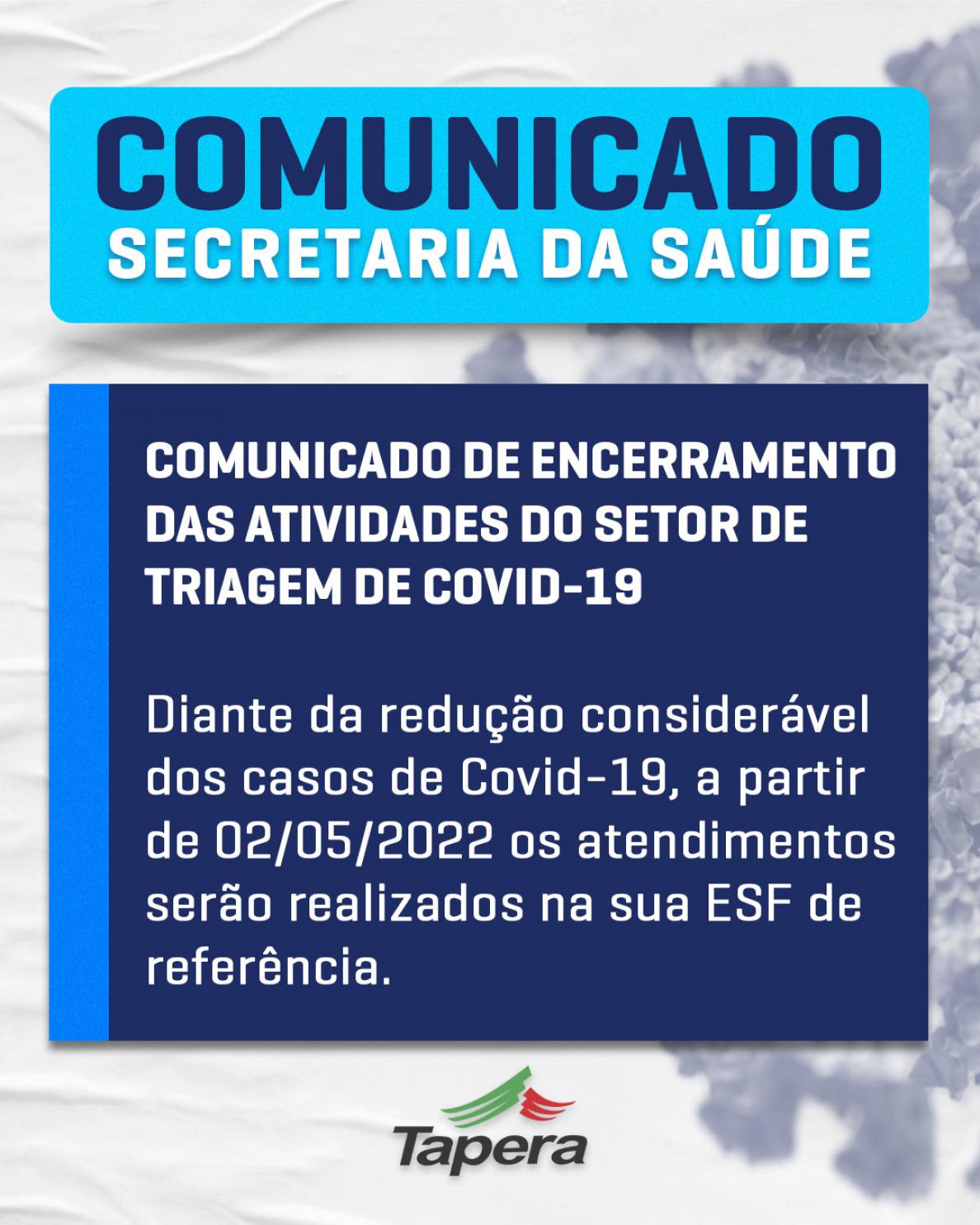 A Secretaria da Saúde informa o encerramento das atividades do setor de triagem do Covid-19