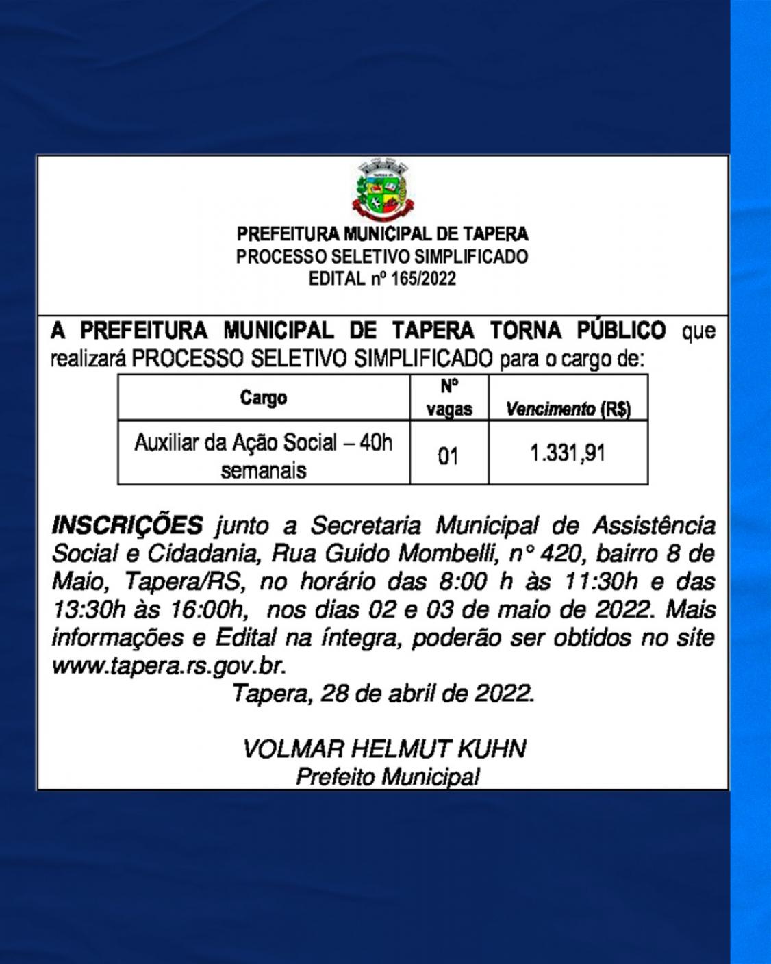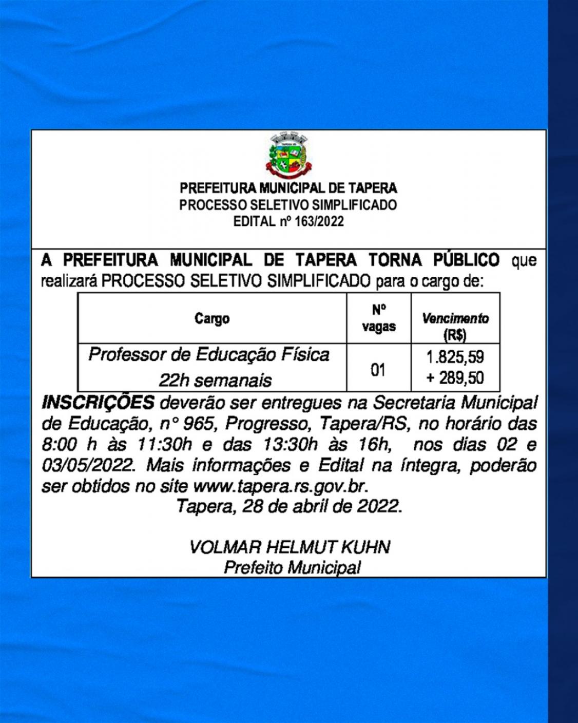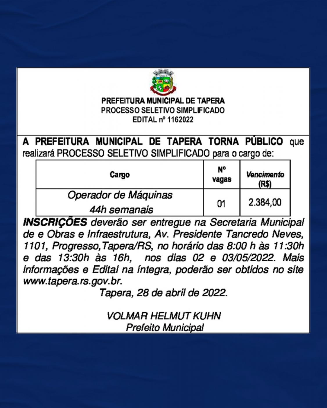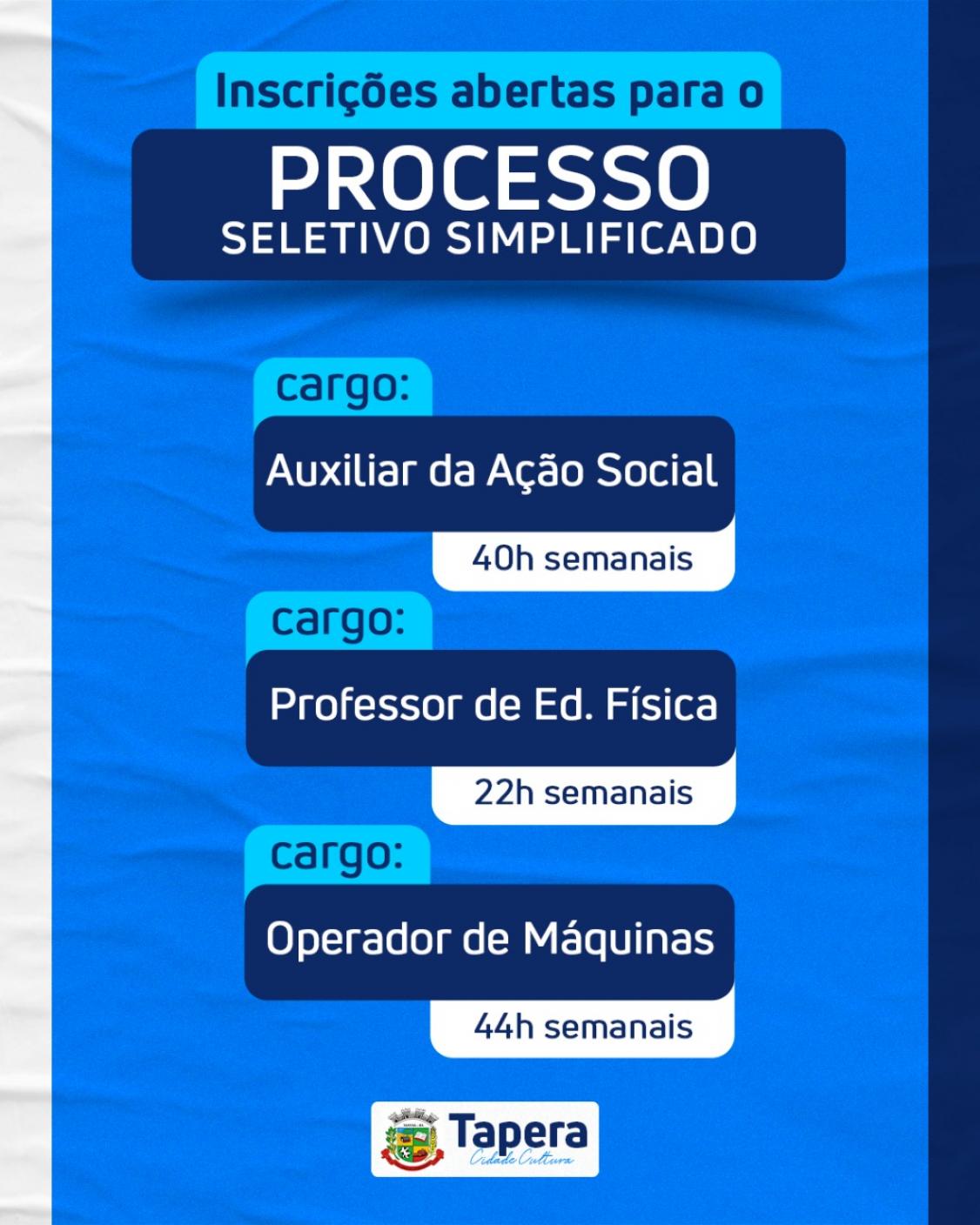 A Prefeitura Municipal de Tapera torna público a realização do Processo Seletivo Simplificado para os cargos: - Auxiliar da Ação Social - Professor de Educação Física - Operador de Máquinas